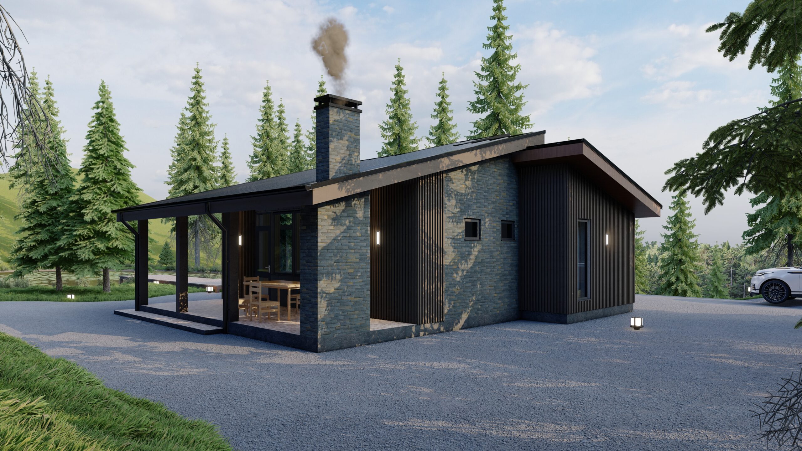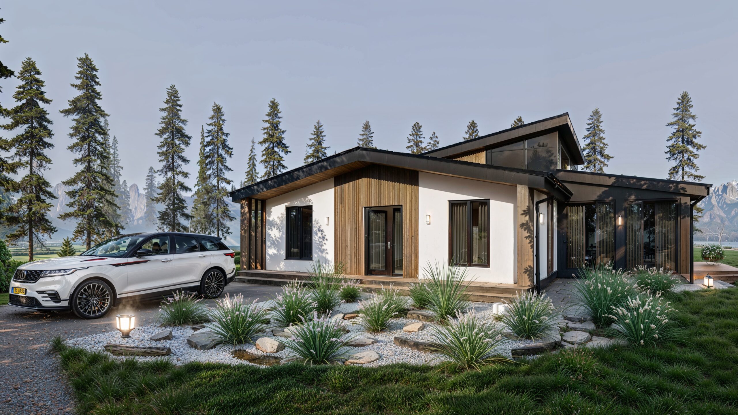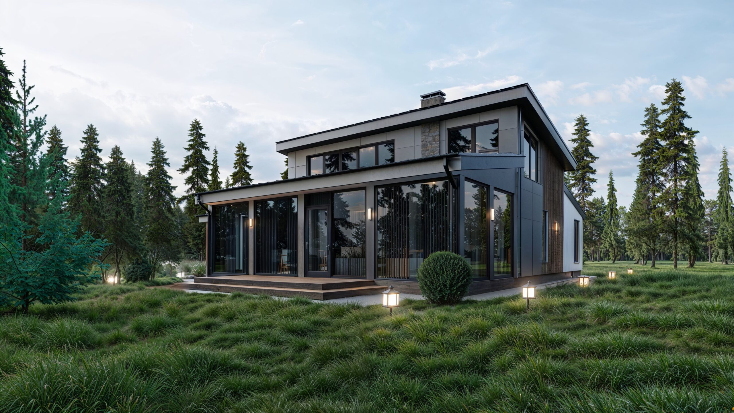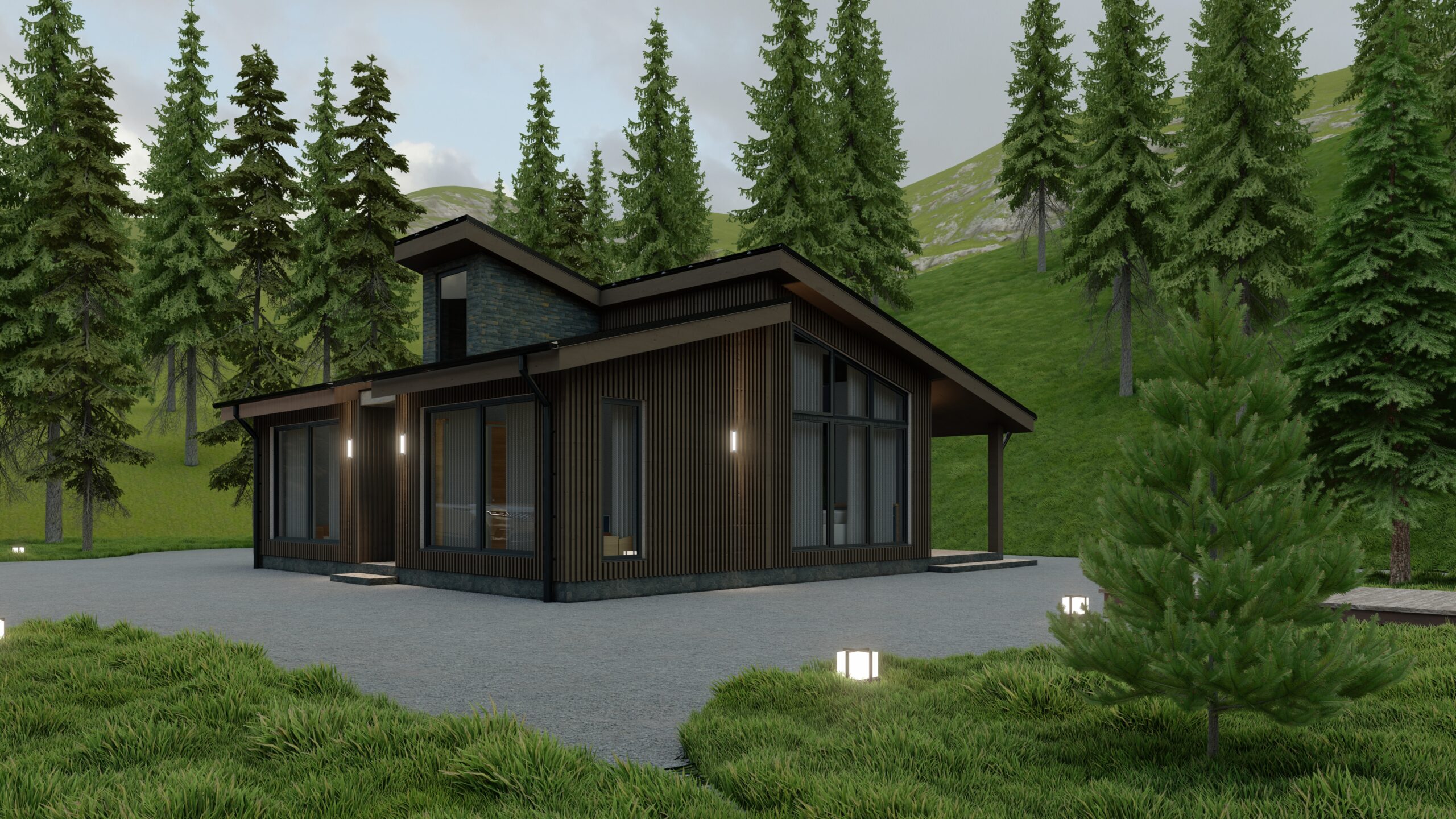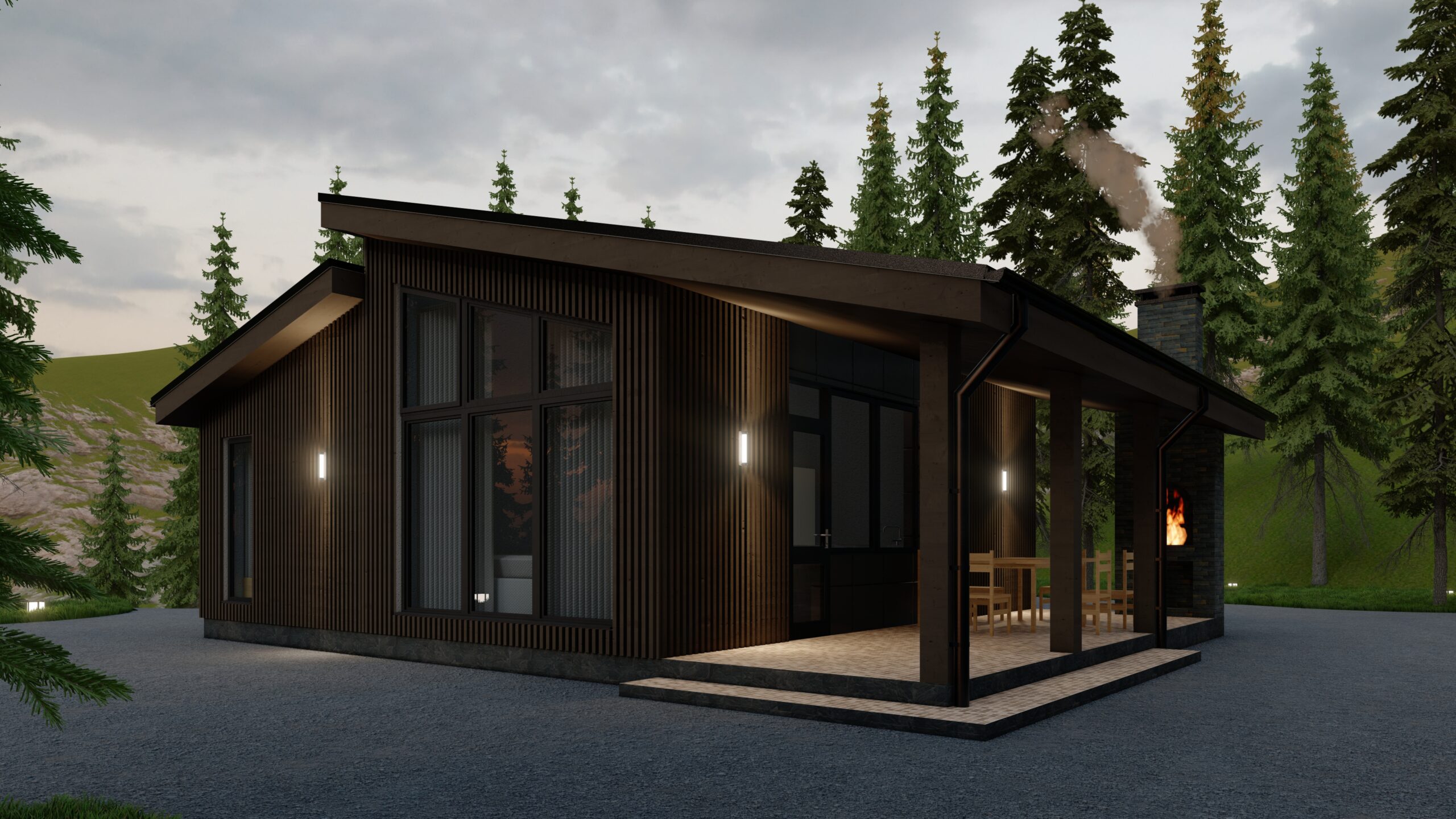 Одноповерховий будинок у стилі сучасного шале з панорамними вікнами, відкритою терасою та додатковим другим рівнем у вітальні зоні. Ідеальне поєднання функціональності та естетики. Підійде для родини, що цінує природне освітлення, простір і контакт із природою. • Просторе планування з високими стелями • Світла кухня-вітальня з виходом на терасу • Панорамні вікна з видом на ліс • Сучасні фасади з натурального дерева та графітового композиту • Можливість адаптації під індивідуальні потреби