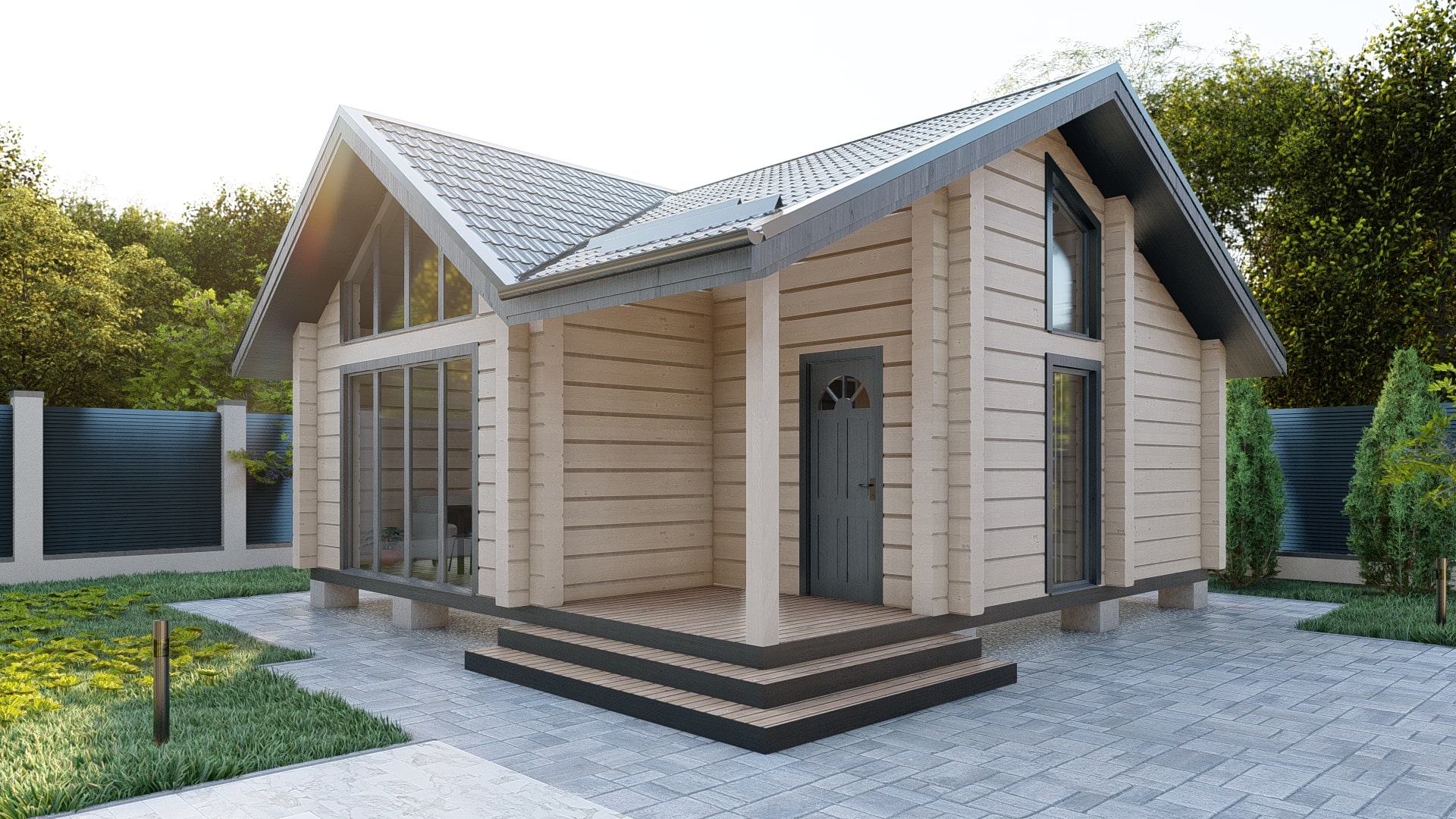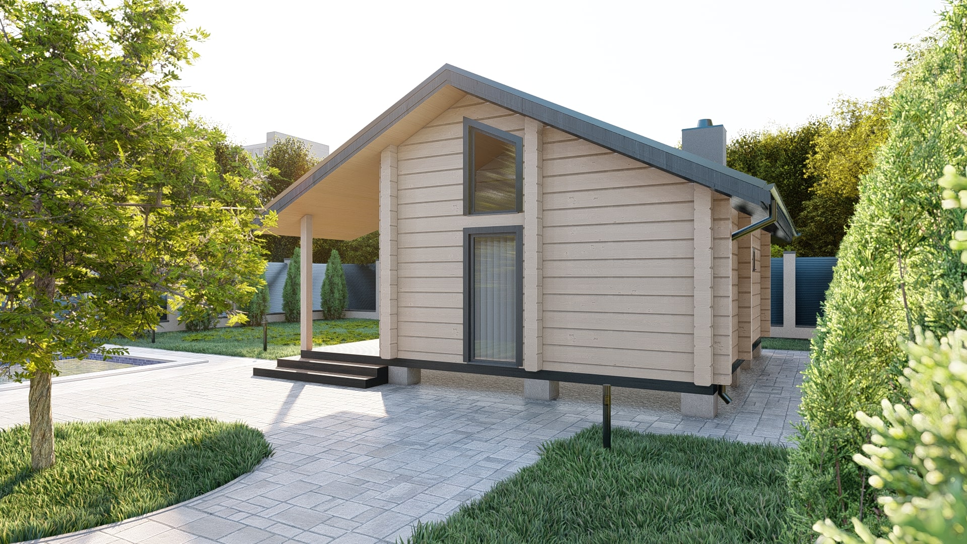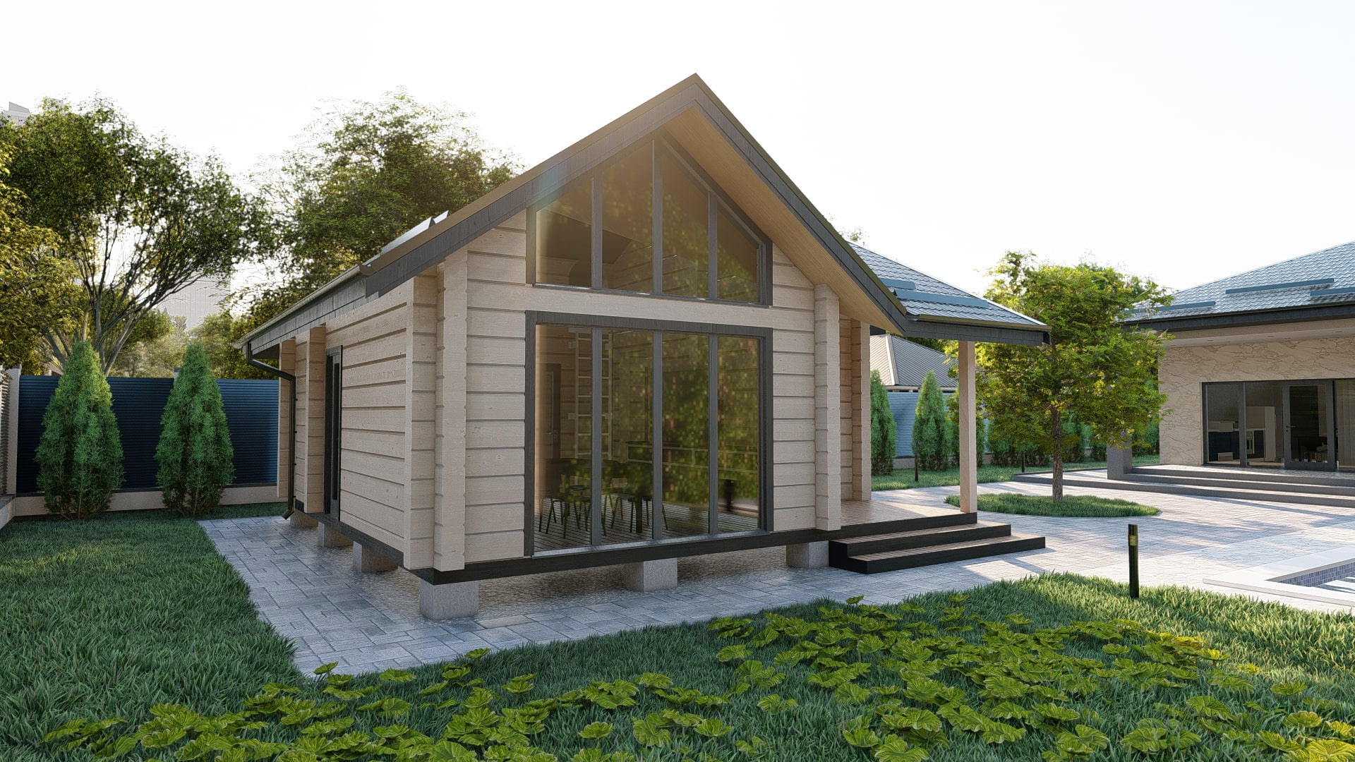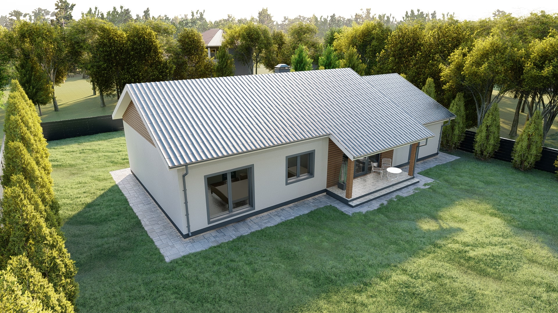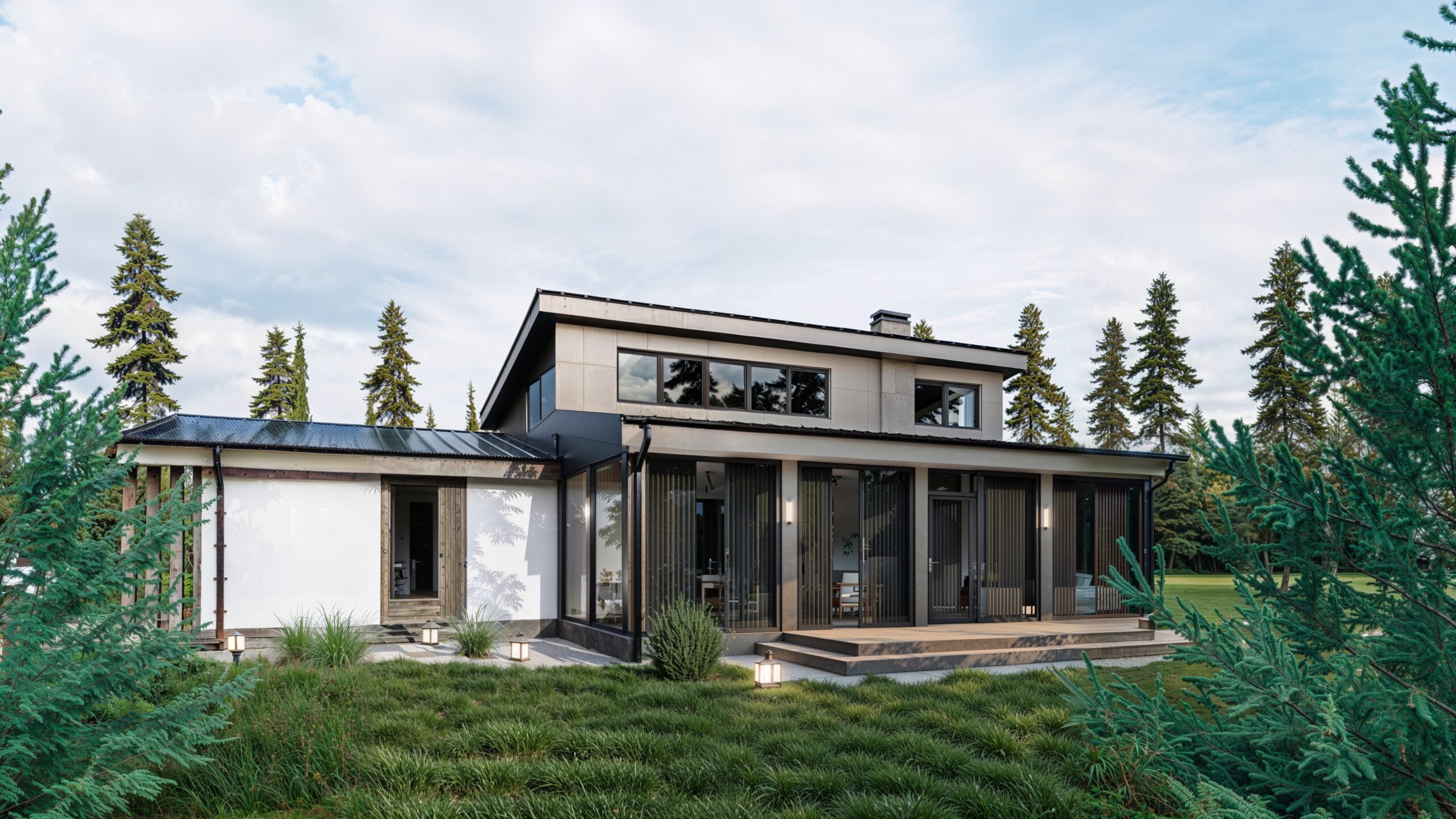 Одноповерховий будинок у стилі сучасного шале з панорамними вікнами, відкритою терасою та додатковим другим рівнем у вітальні зоні. Ідеальне поєднання функціональності та естетики. Підійде для родини, що цінує природне освітлення, простір і контакт із природою. • Просторе планування з високими стелями • Світла кухня-вітальня з виходом на терасу • Панорамні вікна з видом на ліс • Сучасні фасади з натурального дерева та графітового композиту • Можливість адаптації під індивідуальні потреби