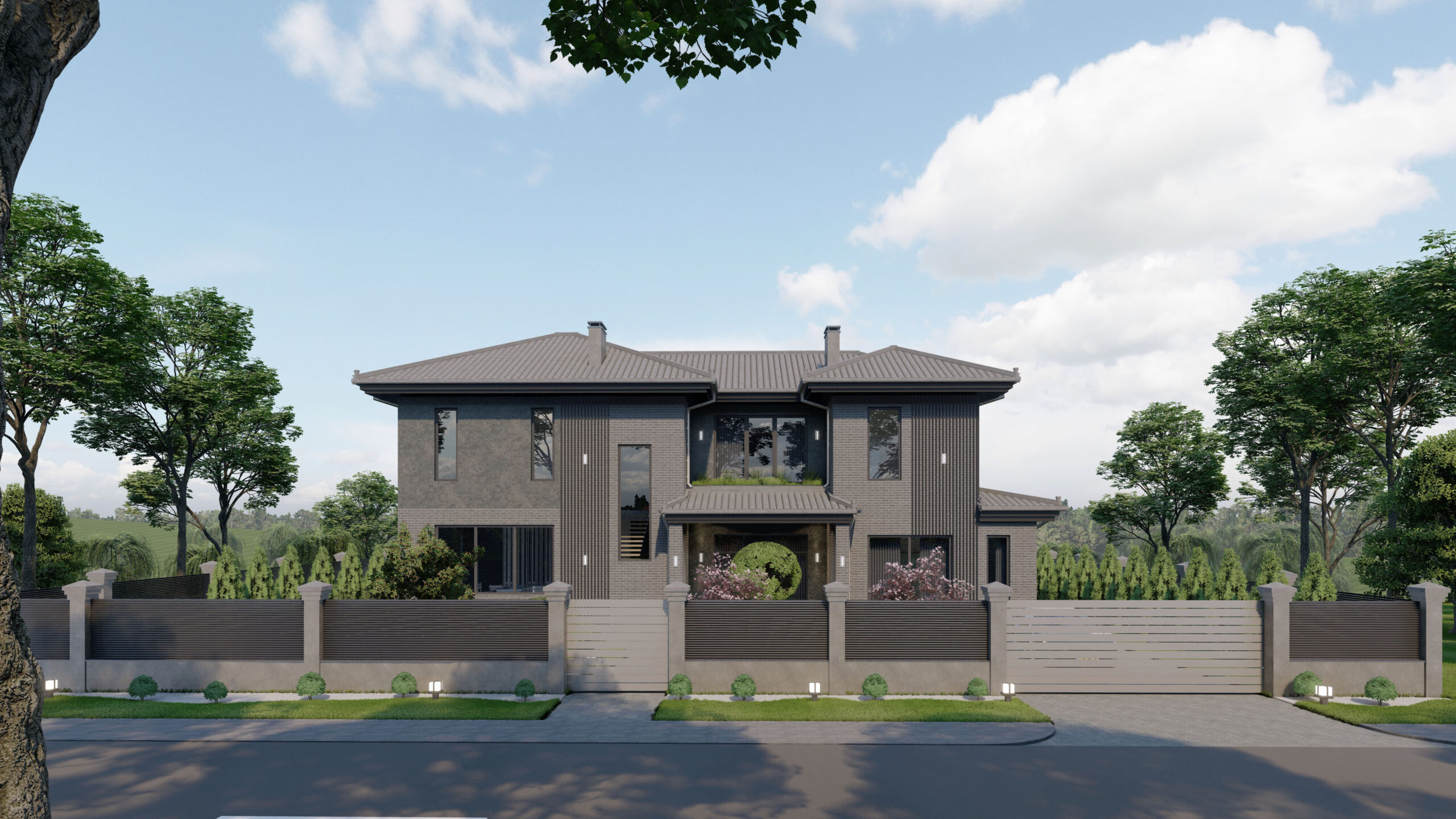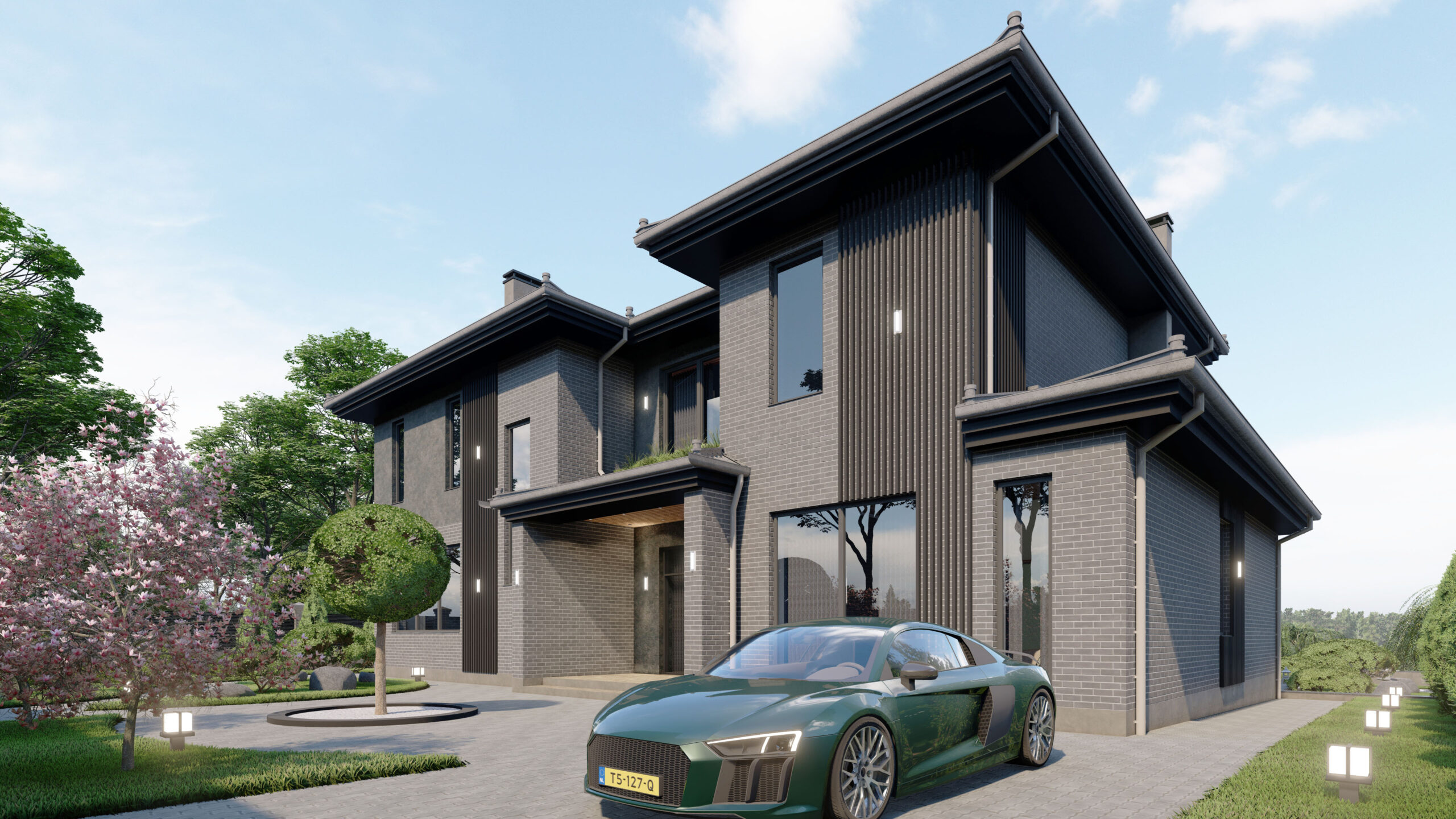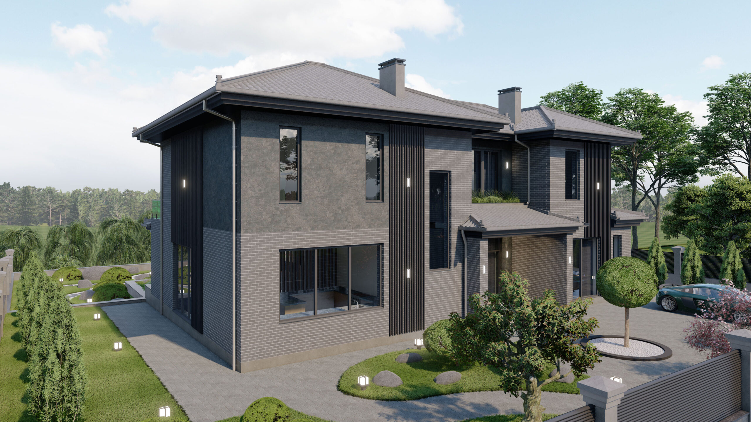 Вишуканий двоповерховий будинок у темних тонах для справжніх поціновувачів сучасної класики. Архітектура поєднує стриману естетику з функціональністю: панорамні вікна, тераси, декоративні вставки, відкрите планування. Ідеально підходить для великої родини або представницького проживання.