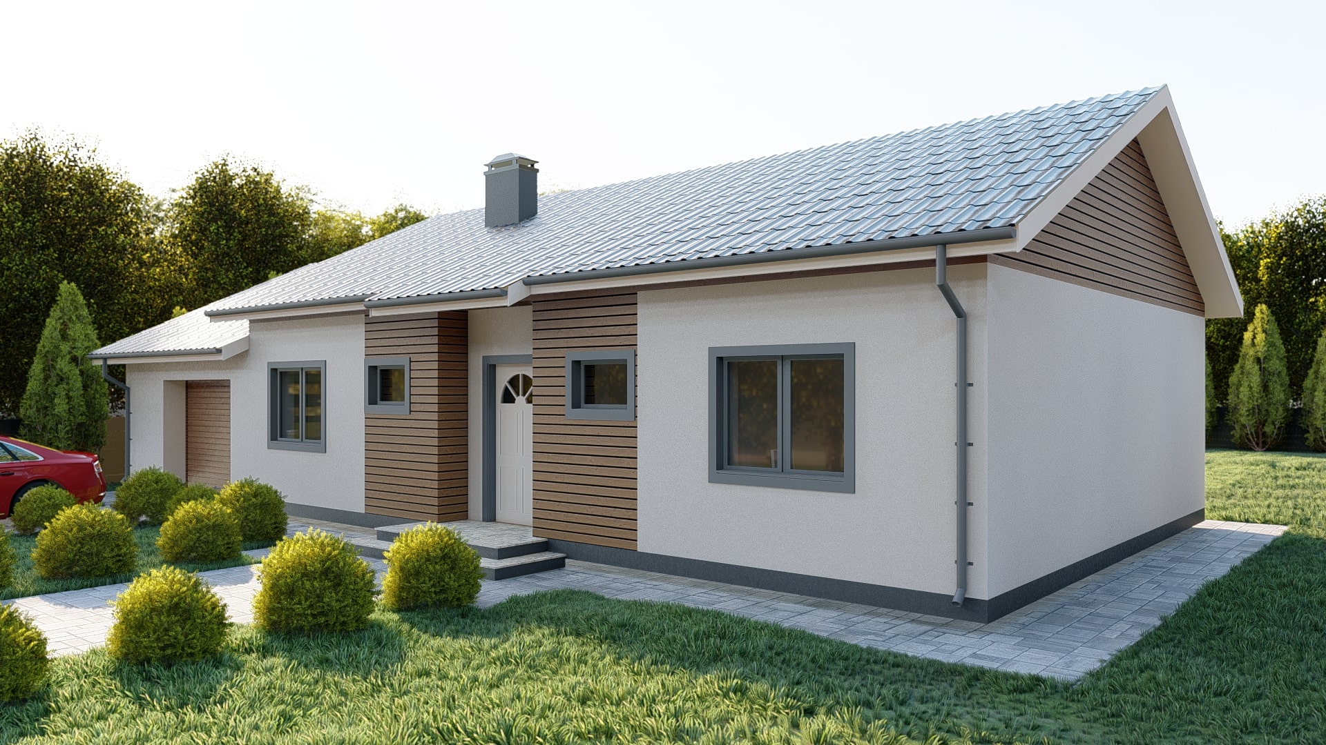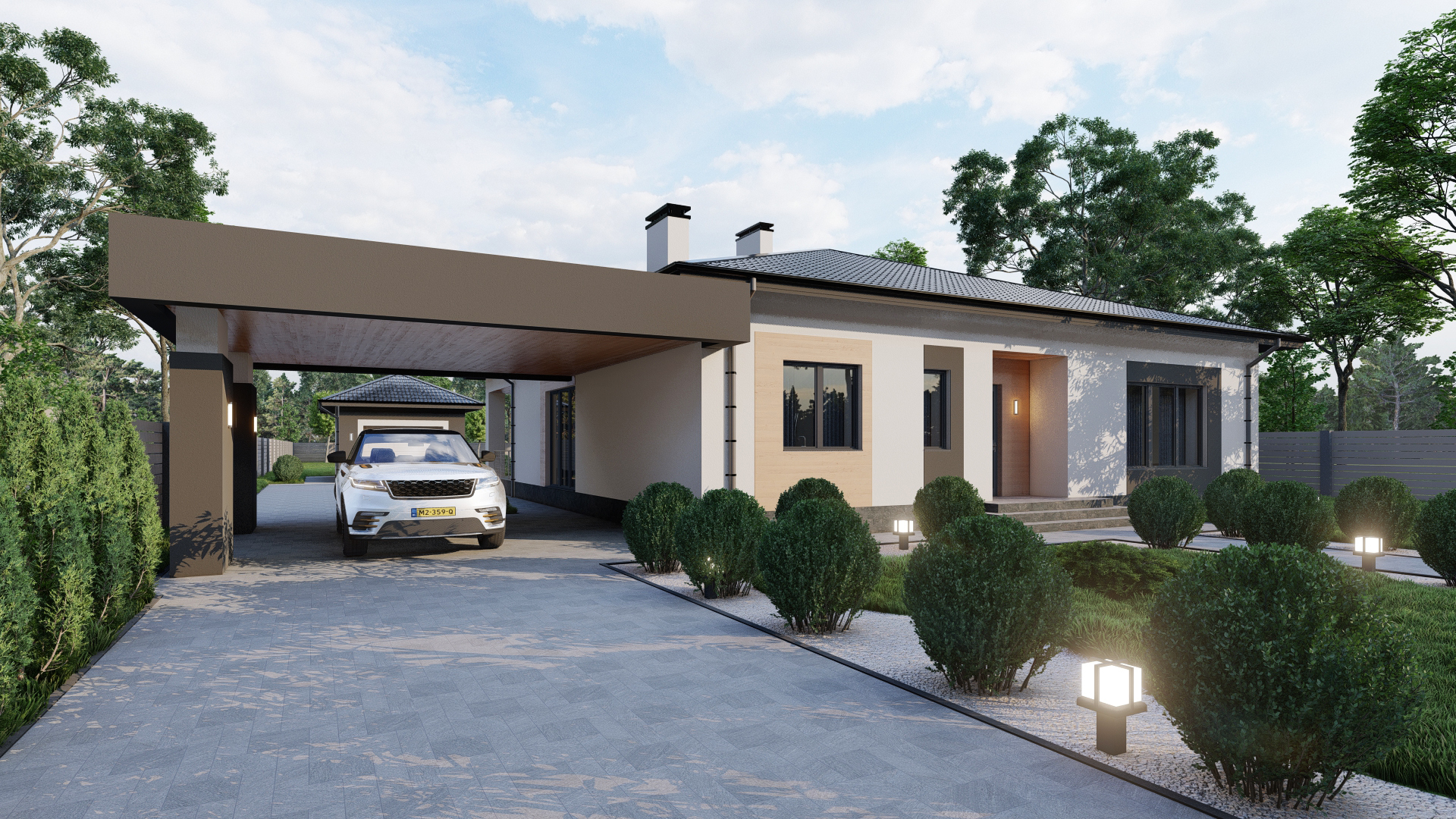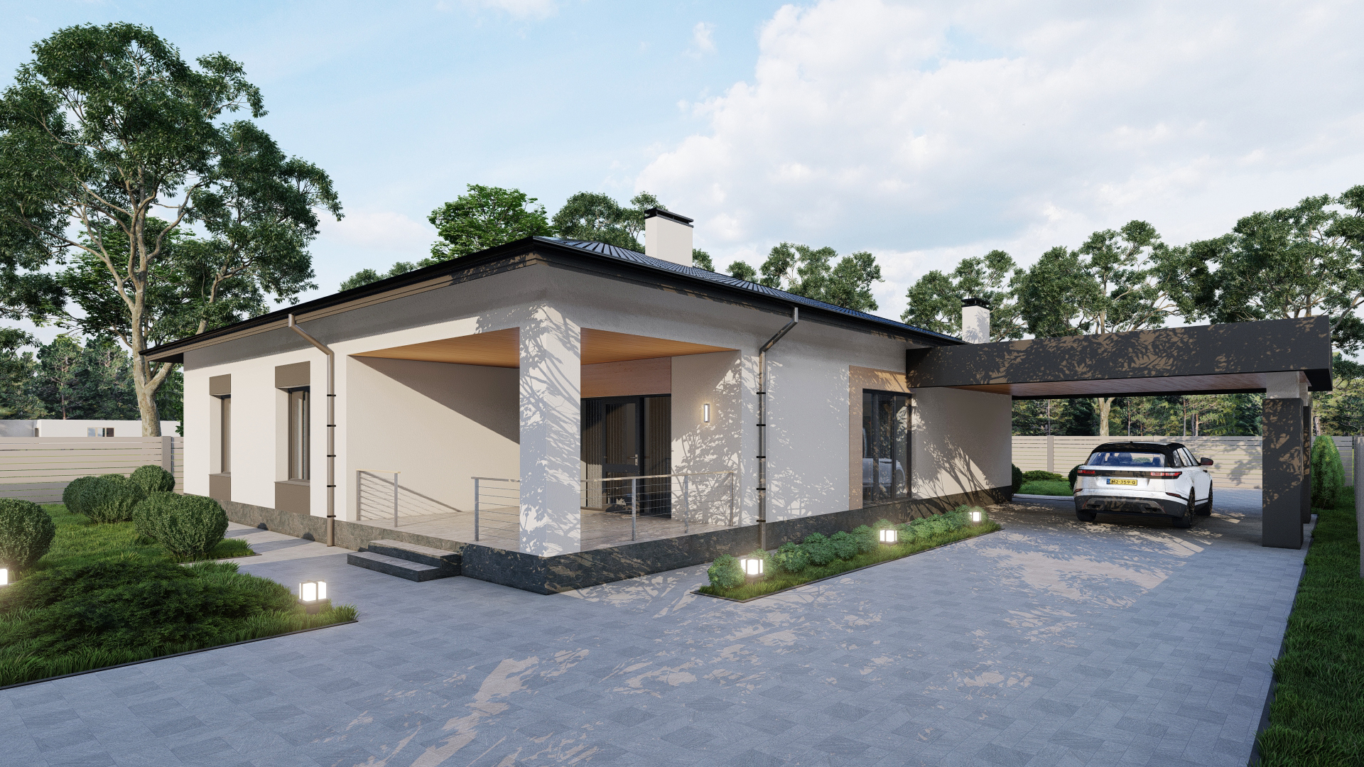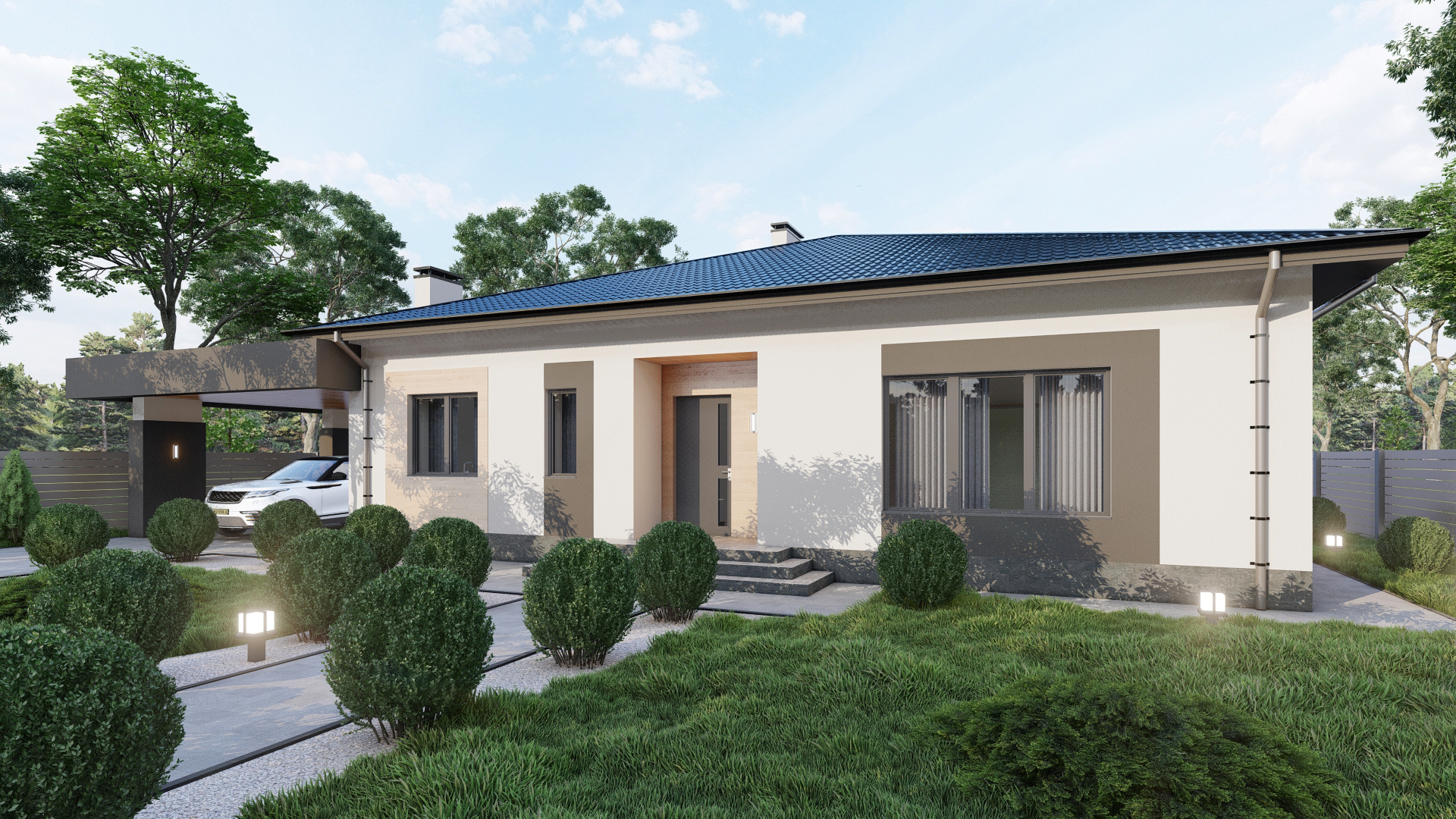 Це проєкт для тих, хто цінує комфорт, функціональність та затишок в одному рівні. Ідеально підходить для сім'ї з дітьми або літньої пари, яка прагне уникнути сходів. Проєкт відрізняється практичним плануванням, що об'єднує житлову зону та гараж під одним дахом, що особливо зручно в холодну пору року. Сучасний дизайн з елементами класики — світлий фасад, акценти з дерев'яних панелей та темна покрівля — створює елегантний та водночас стриманий вигляд. Планування включає простору кухню-вітальню, майстер-спальню, одну або дві дитячі/гостьові кімнати та технічне приміщення з доступом до гаража. Цей будинок — втілення раціональності та домашнього тепла, де кожен квадратний метр використано з максимальною користю.
