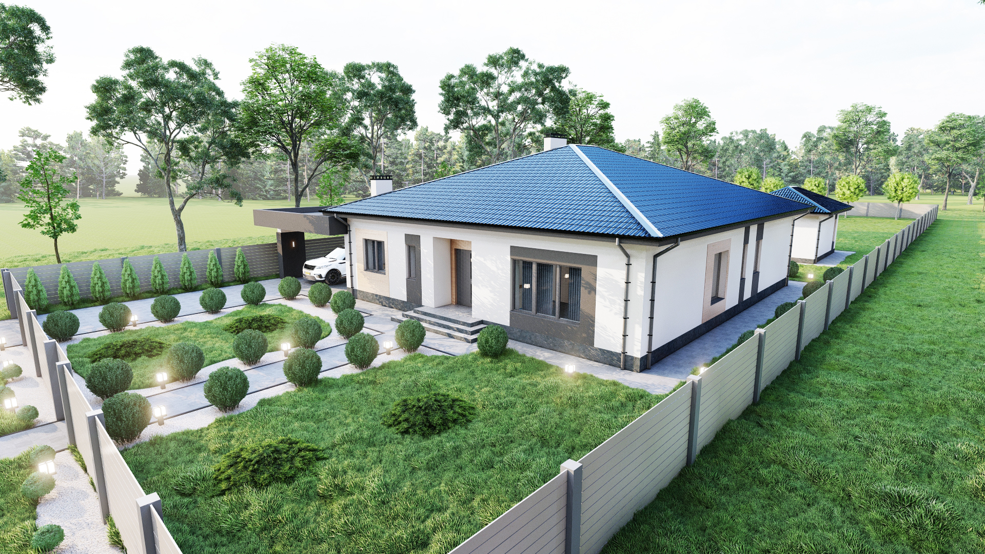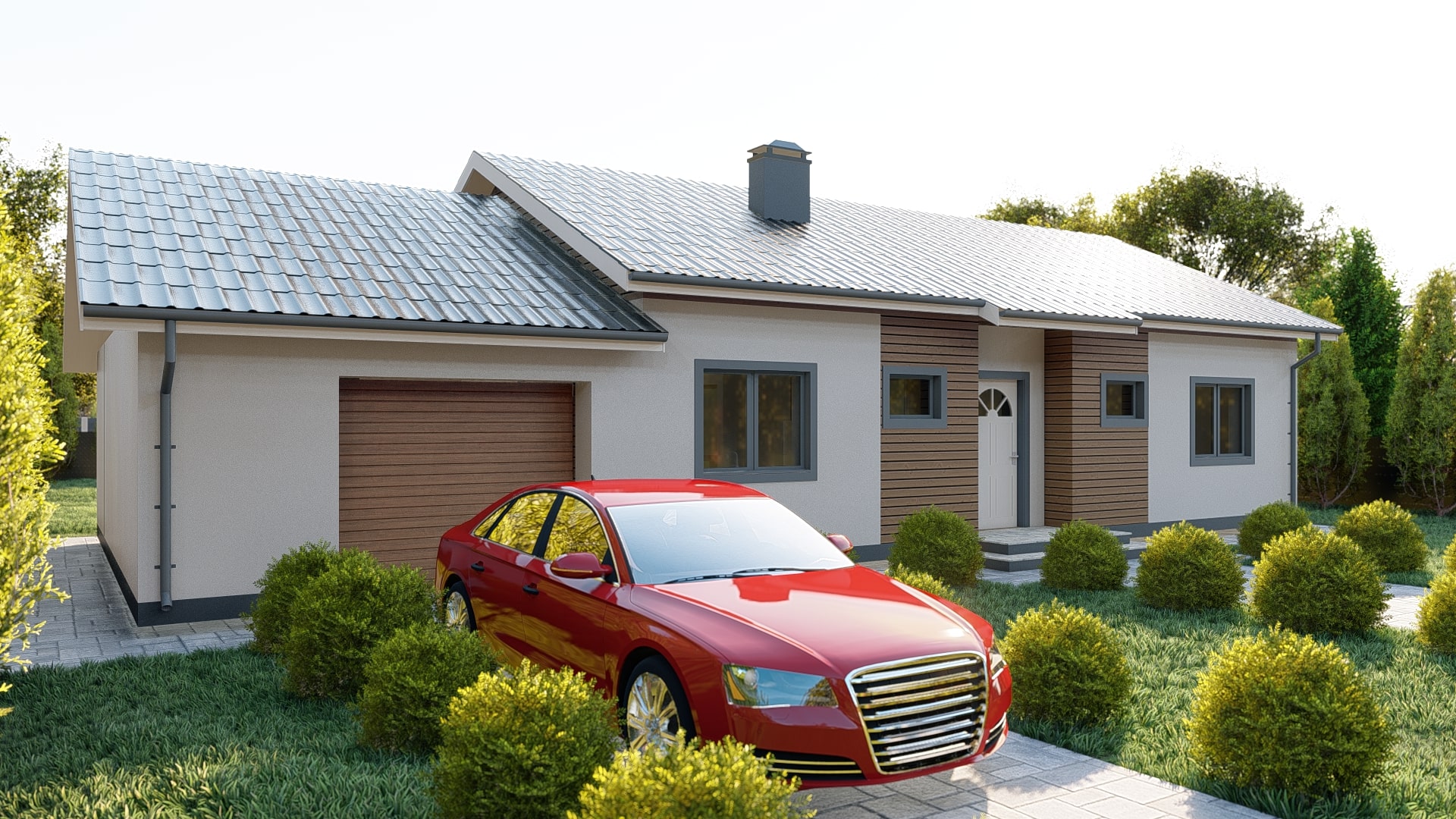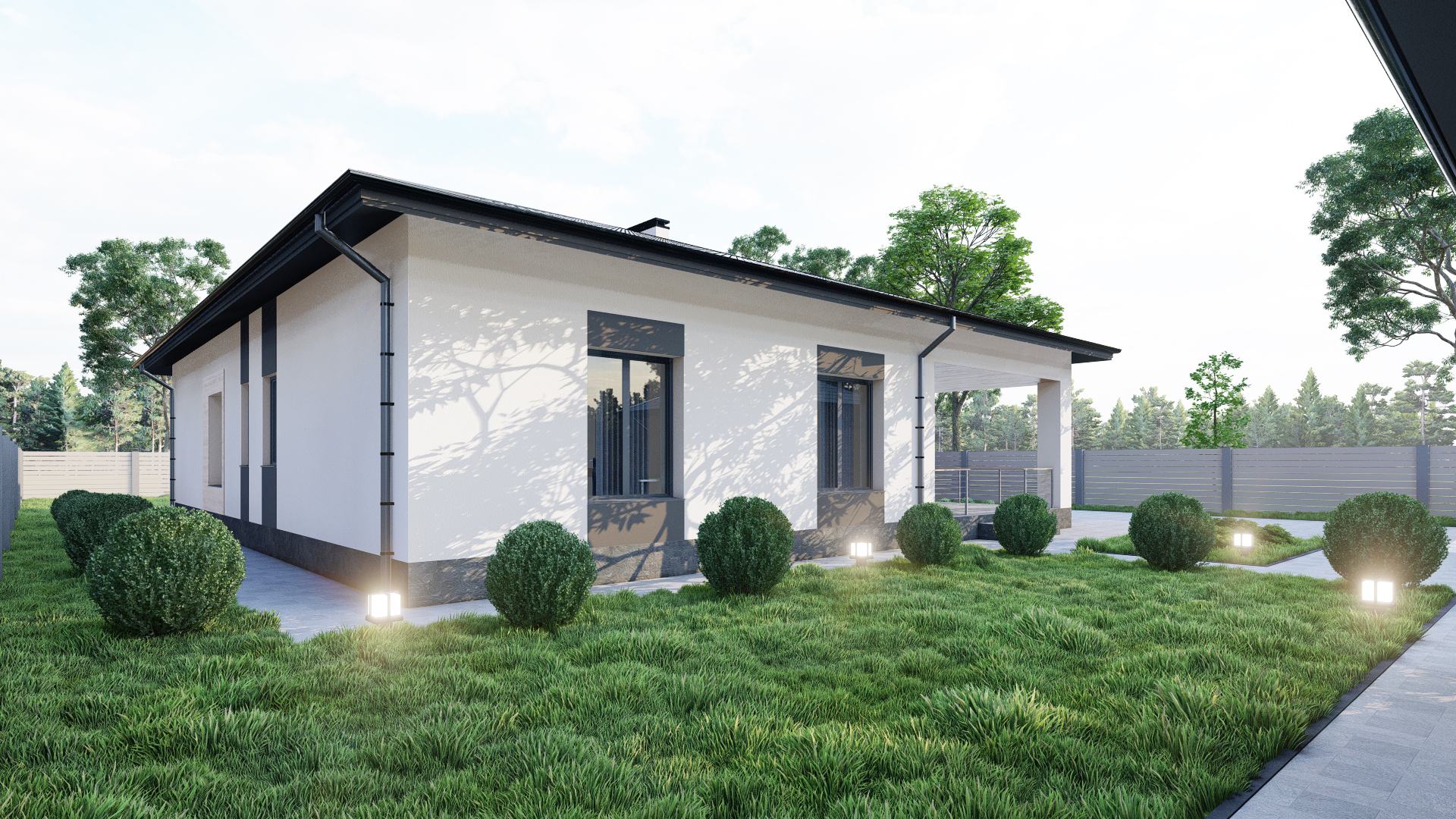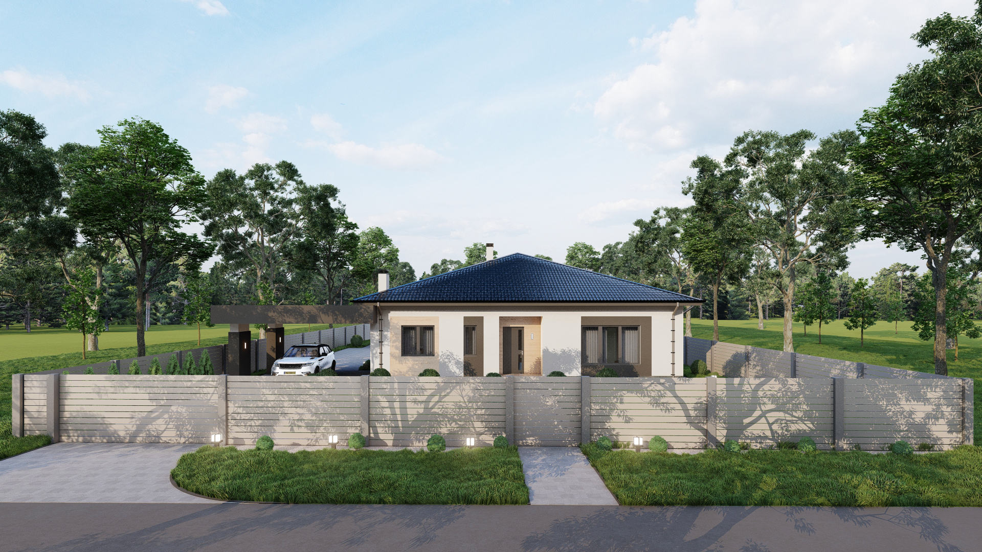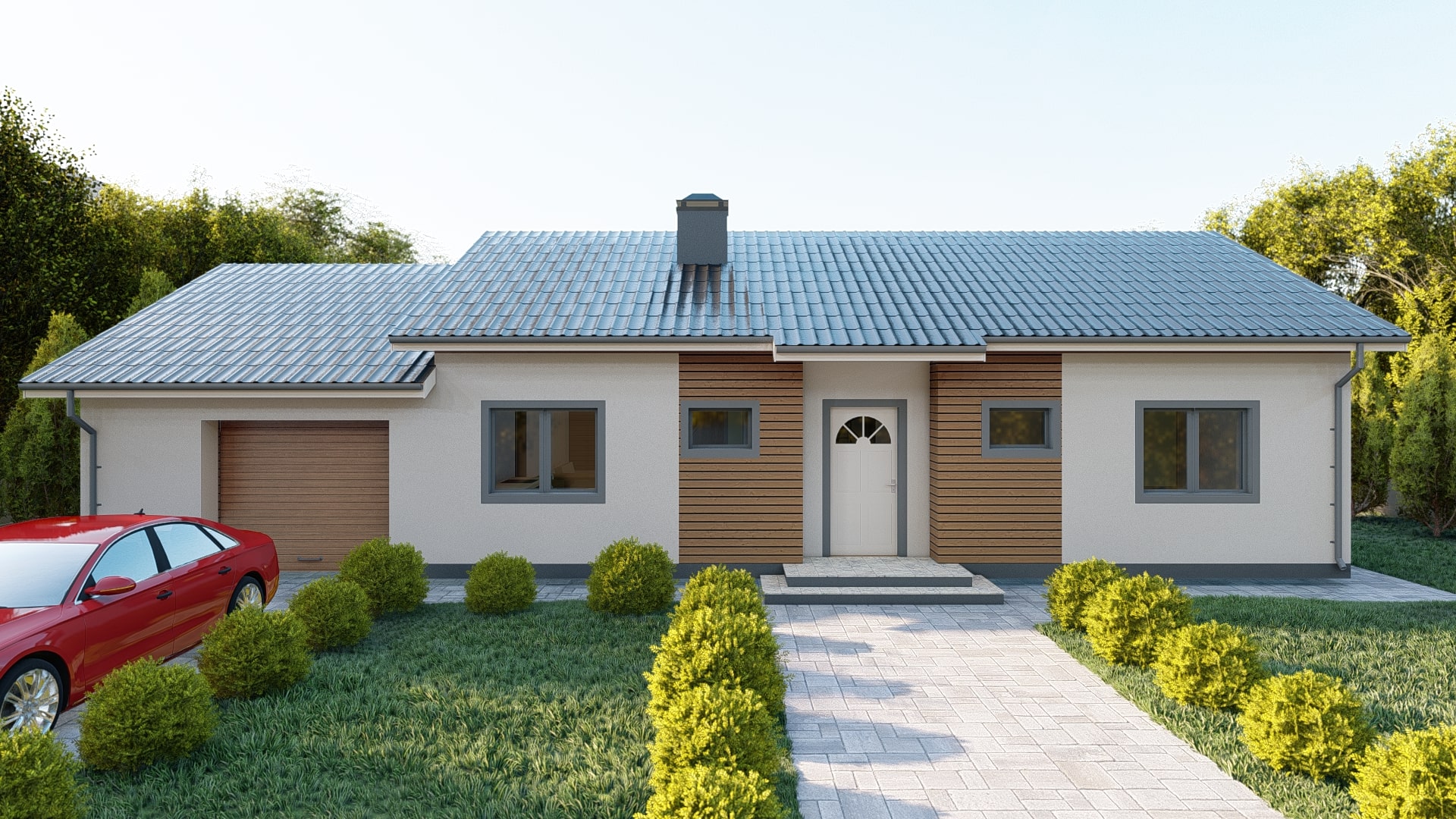 Це проєкт для тих, хто цінує комфорт, функціональність та затишок в одному рівні. Ідеально підходить для сім'ї з дітьми або літньої пари, яка прагне уникнути сходів. Проєкт відрізняється практичним плануванням, що об'єднує житлову зону та гараж під одним дахом, що особливо зручно в холодну пору року. Сучасний дизайн з елементами класики — світлий фасад, акценти з дерев'яних панелей та темна покрівля — створює елегантний та водночас стриманий вигляд. Планування включає простору кухню-вітальню, майстер-спальню, одну або дві дитячі/гостьові кімнати та технічне приміщення з доступом до гаража. Цей будинок — втілення раціональності та домашнього тепла, де кожен квадратний метр використано з максимальною користю.