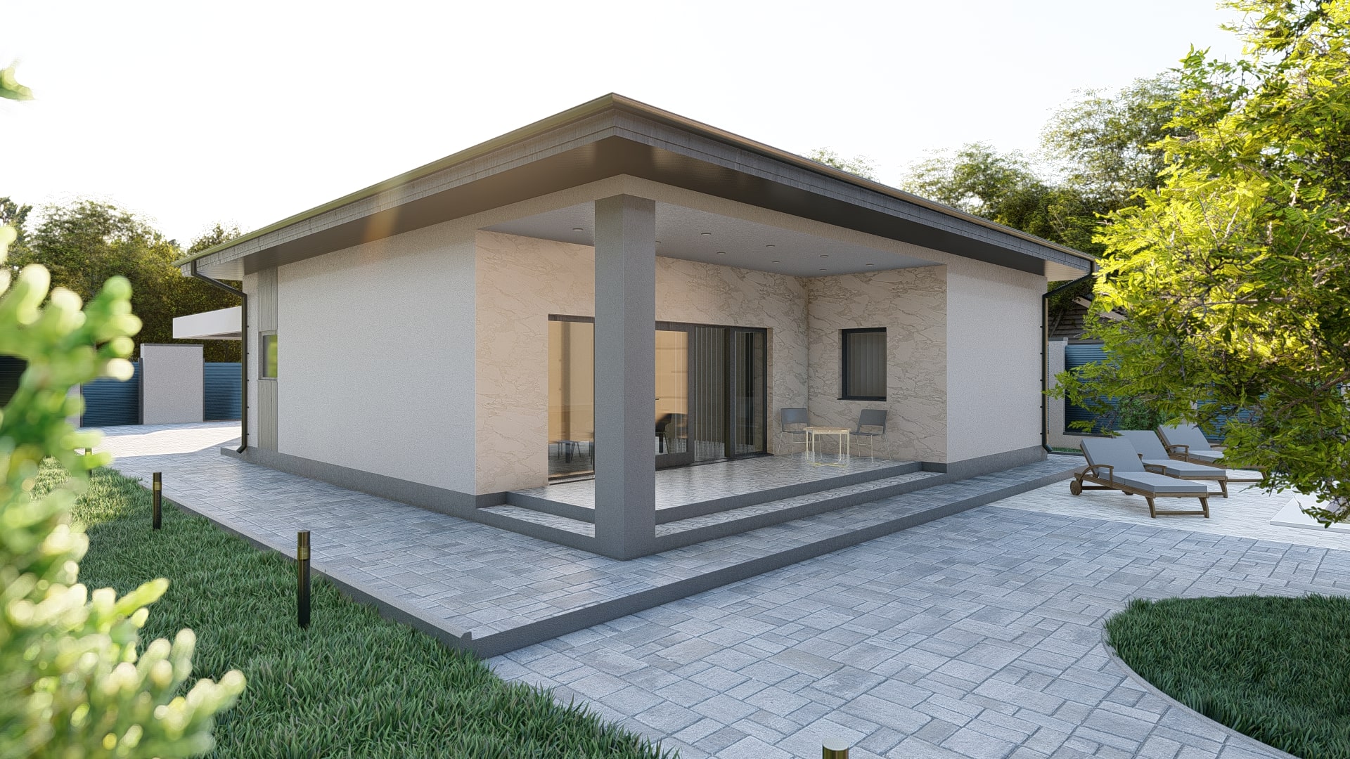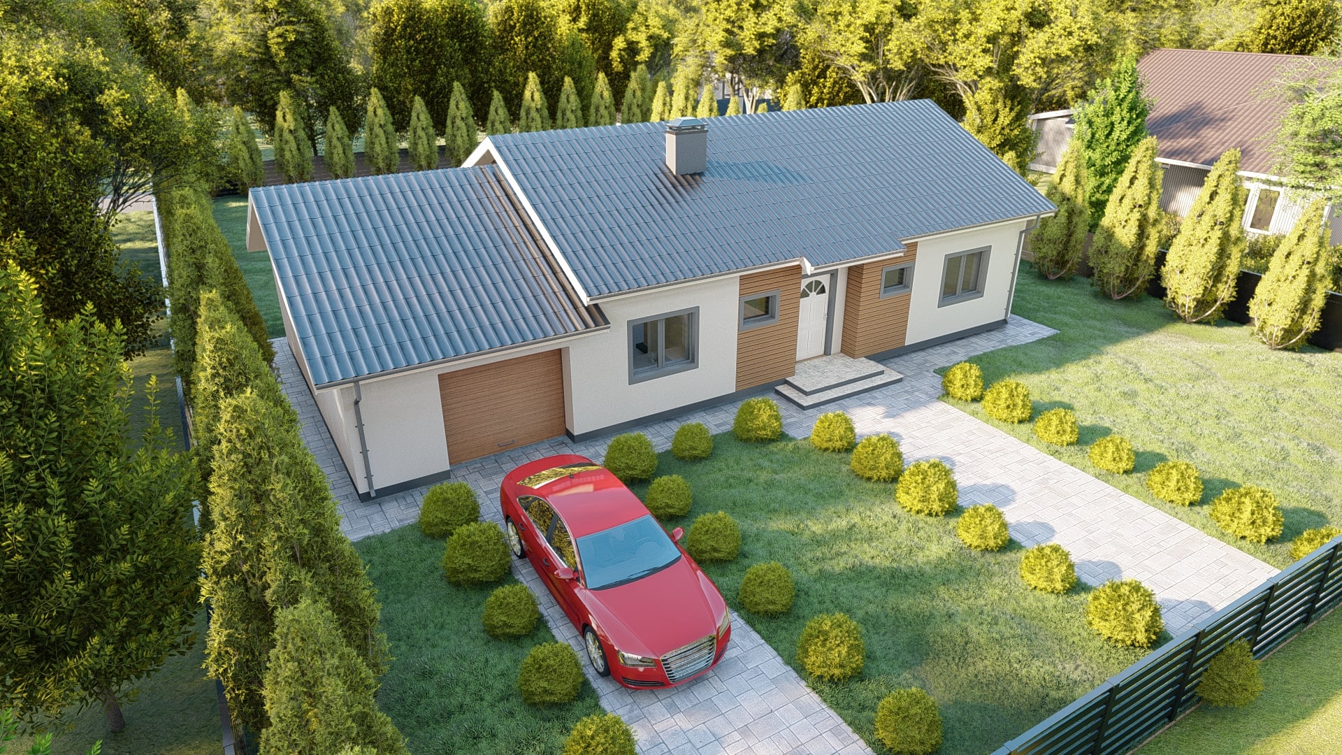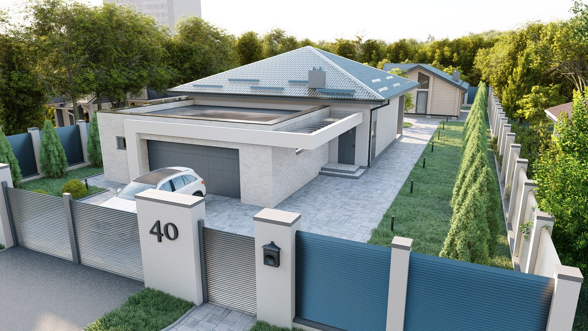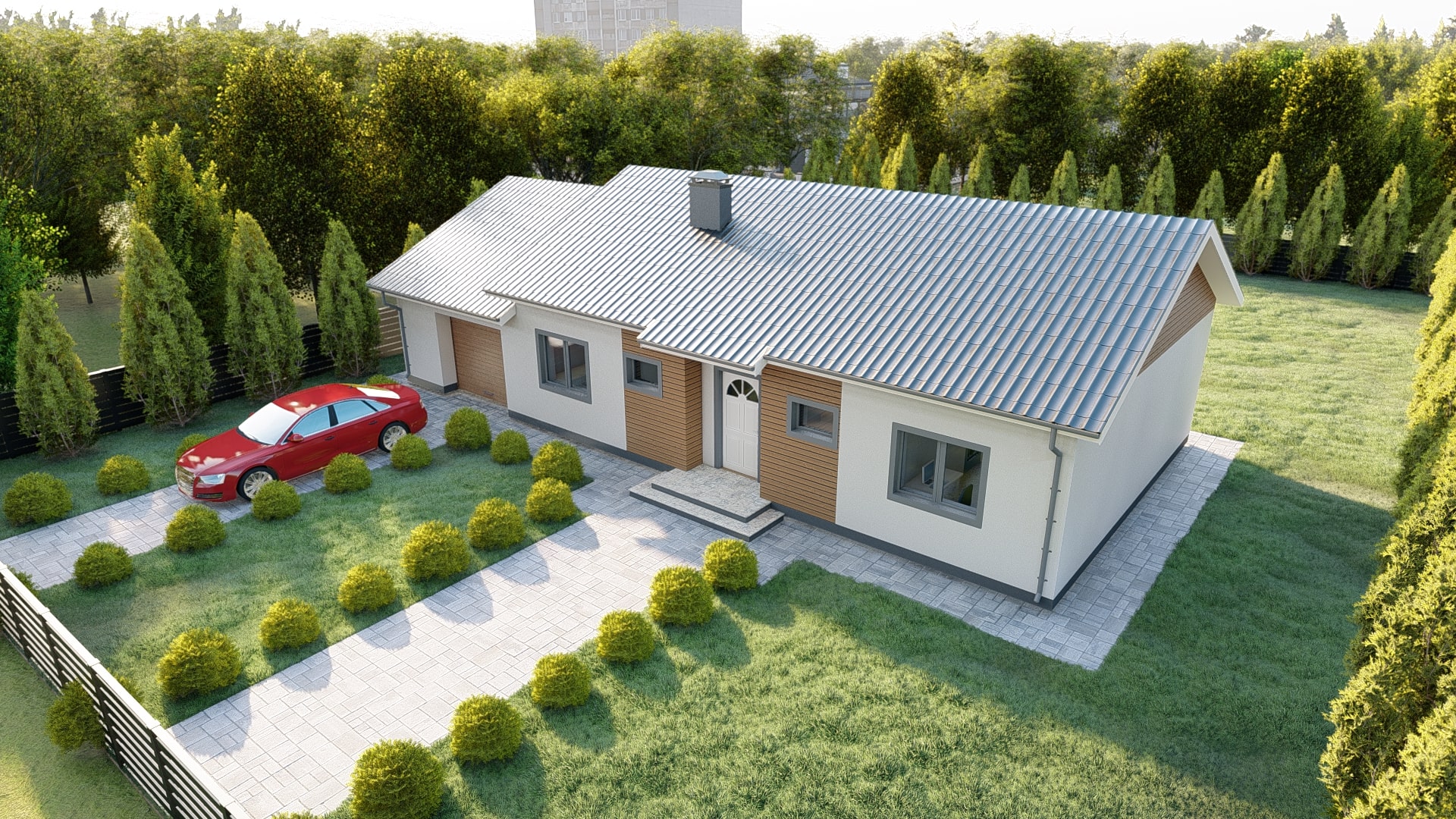 Це проєкт для тих, хто цінує комфорт, функціональність та затишок в одному рівні. Ідеально підходить для сім'ї з дітьми або літньої пари, яка прагне уникнути сходів. Проєкт відрізняється практичним плануванням, що об'єднує житлову зону та гараж під одним дахом, що особливо зручно в холодну пору року. Сучасний дизайн з елементами класики — світлий фасад, акценти з дерев'яних панелей та темна покрівля — створює елегантний та водночас стриманий вигляд. Планування включає простору кухню-вітальню, майстер-спальню, одну або дві дитячі/гостьові кімнати та технічне приміщення з доступом до гаража. Цей будинок — втілення раціональності та домашнього тепла, де кожен квадратний метр використано з максимальною користю.