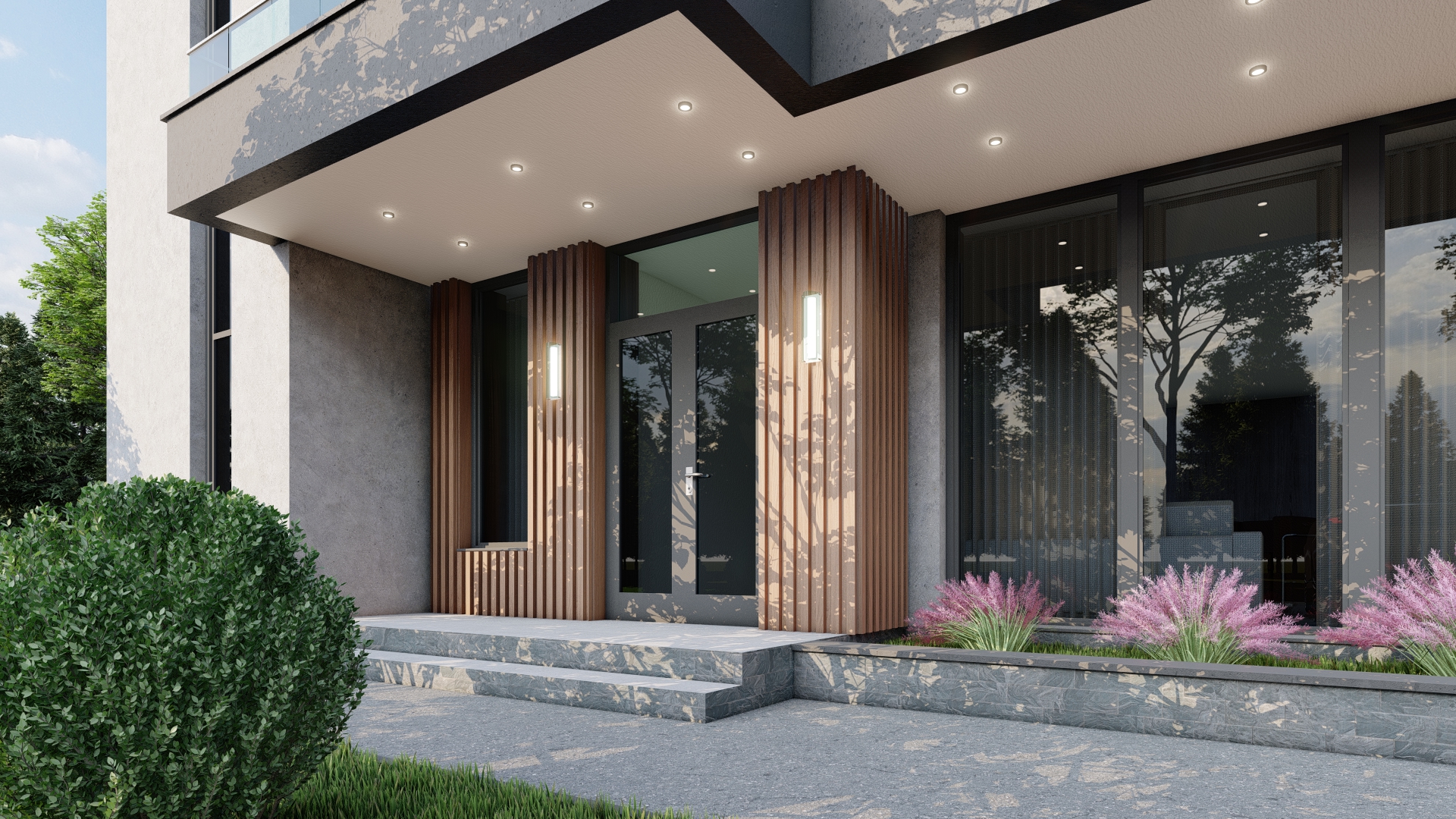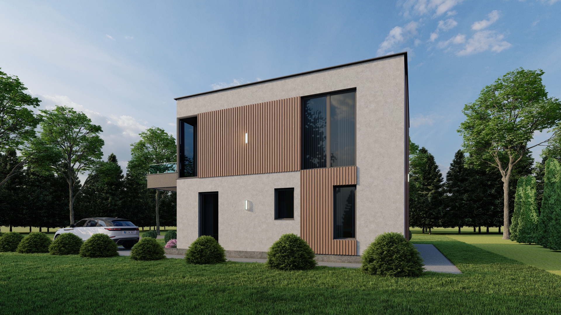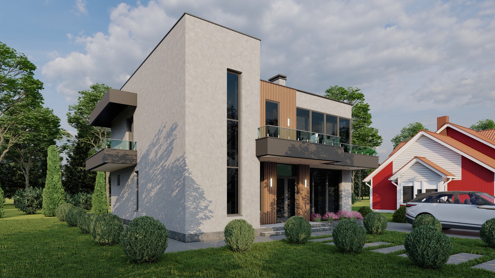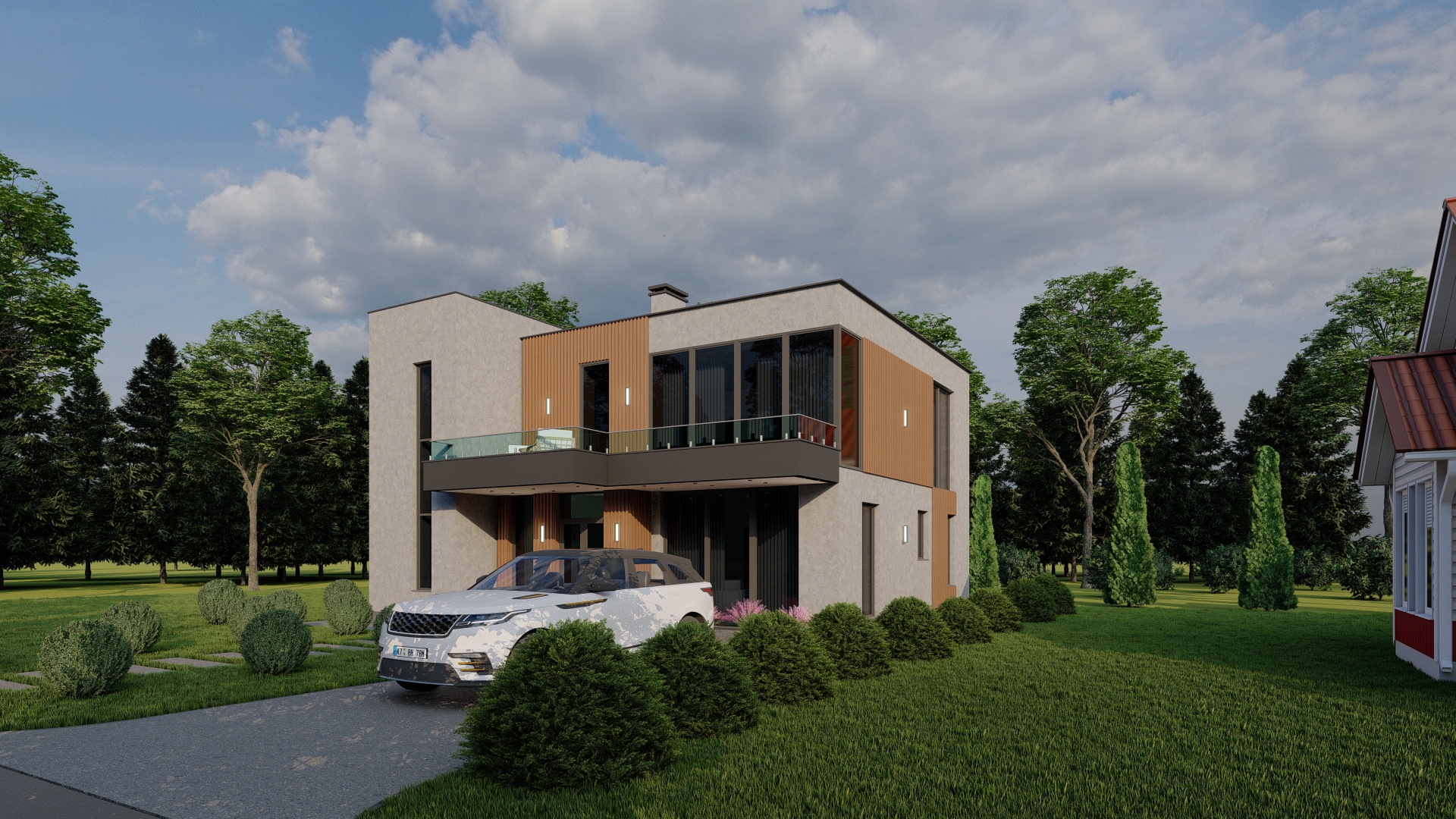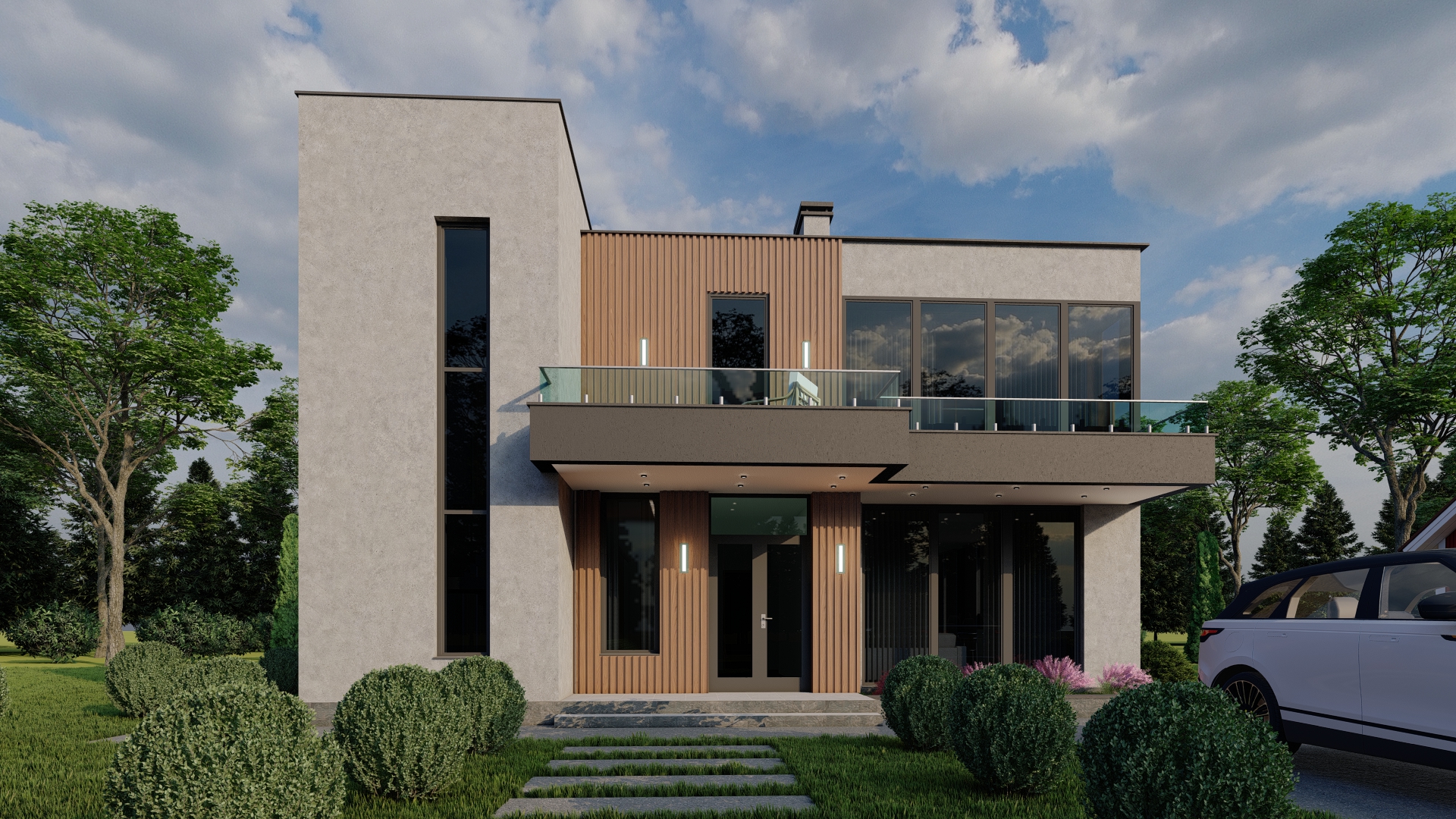 Сучасний двоповерховий будинок з акцентом на геометрію та простір. Ідеальний для родини, яка цінує мінімалізм, великі вікна та функціональні балкони. Проект передбачає відкриту терасу, сучасне оздоблення фасаду деревом і склом, а також простору зону перед входом.