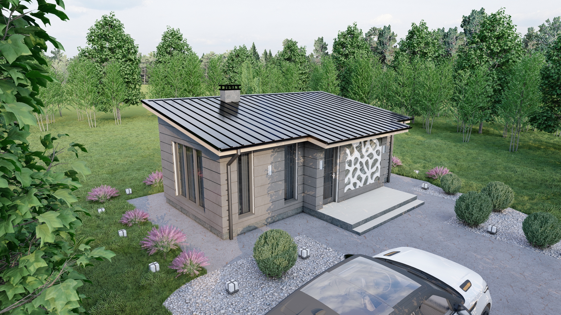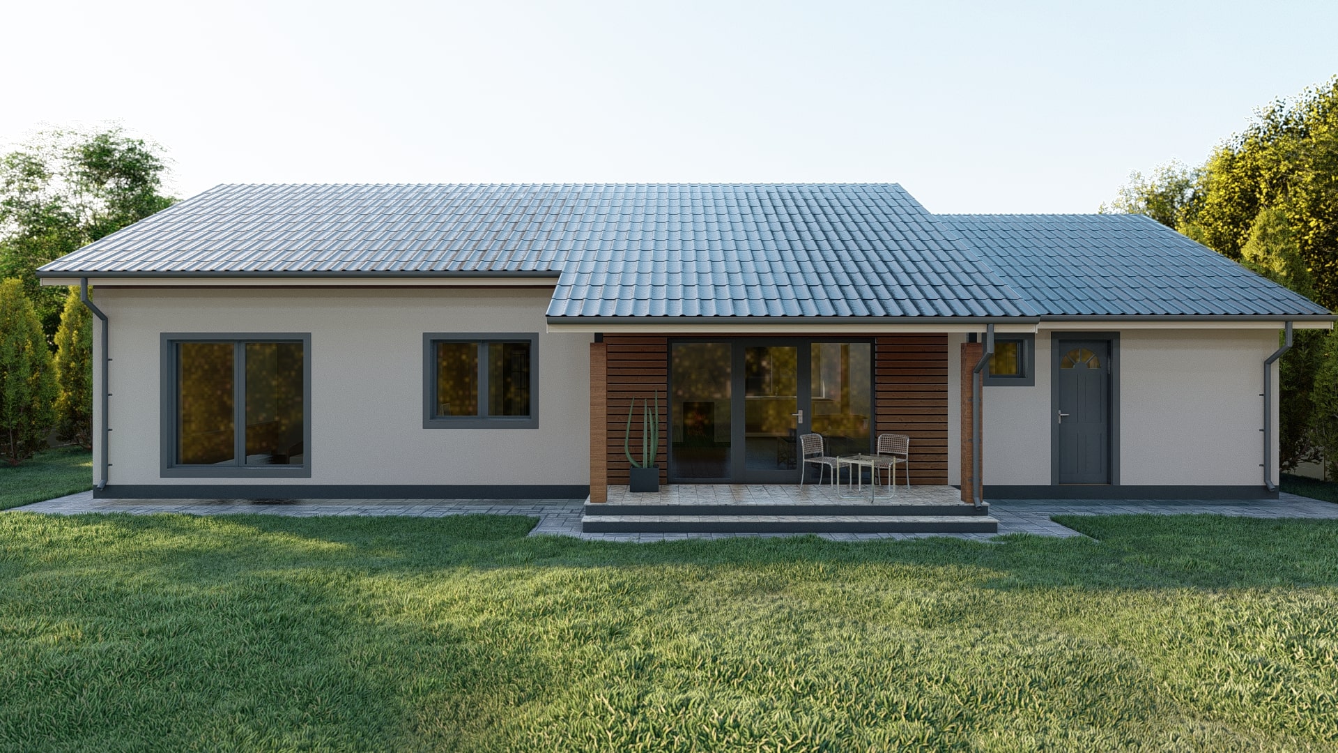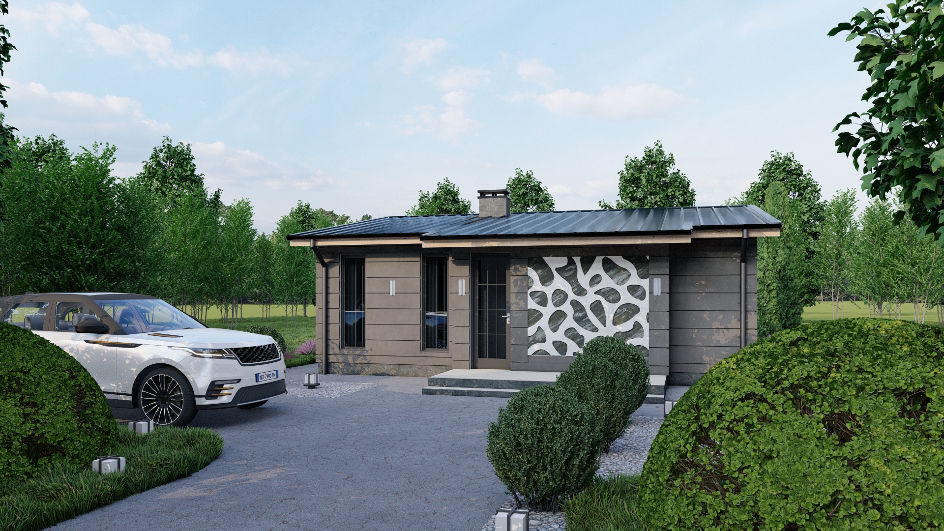 Цей сучасний одноповерховий будинок створений для тих, хто цінує затишок, природу та теплі вечори біля каміну. Облицювання з декоративного темного каменю та дерев’яні акценти надають йому преміального вигляду, а зручне планування забезпечує комфортне перебування навіть у холодну пору року. Велика тераса з каміном і зона барбекю дозволяють насолоджуватися кожною миттю на природі.