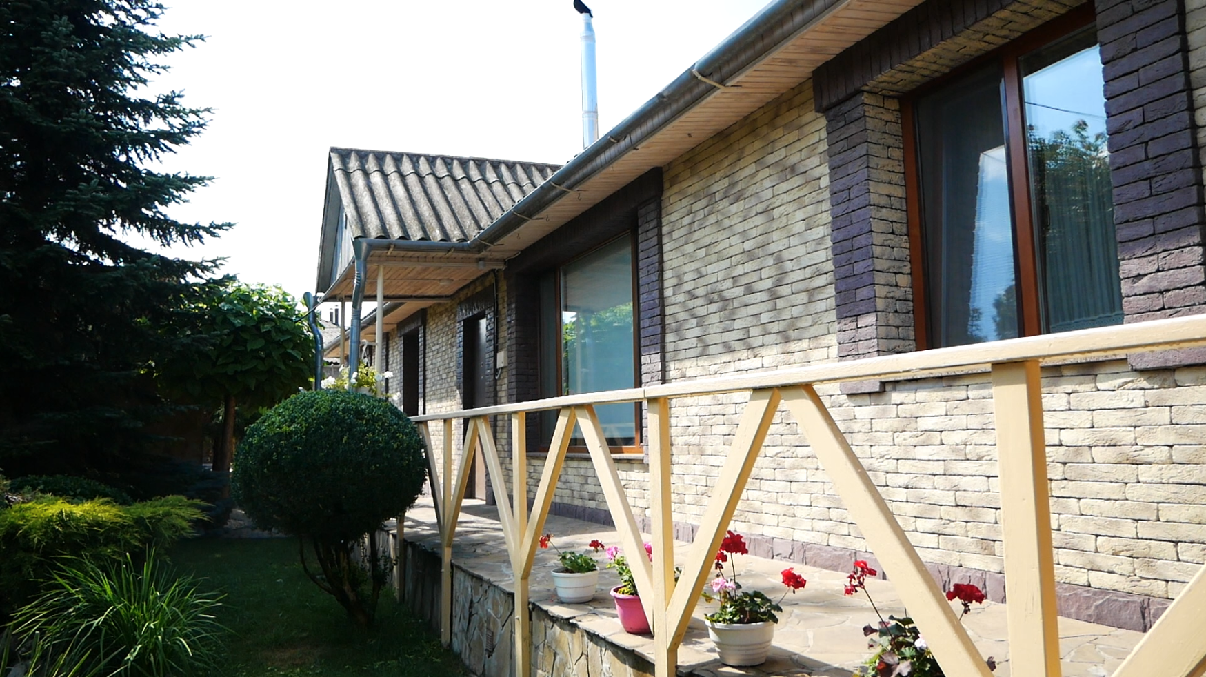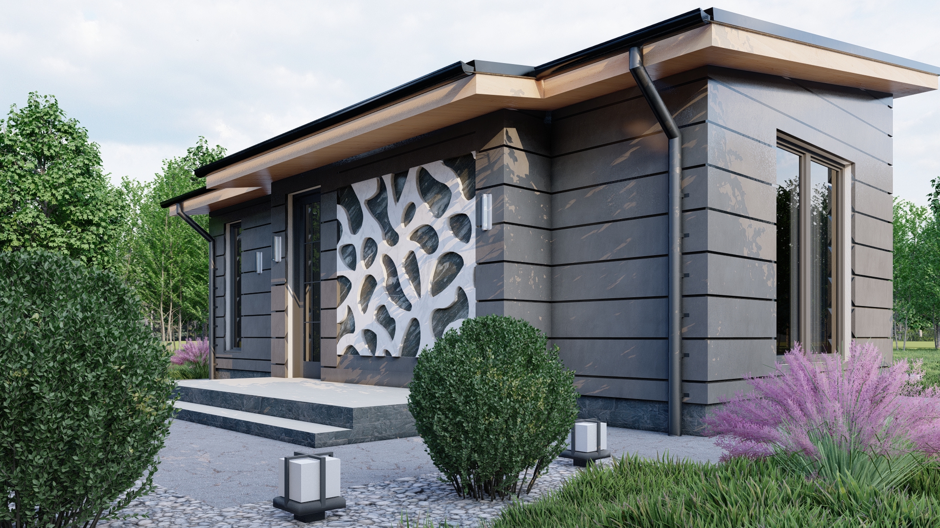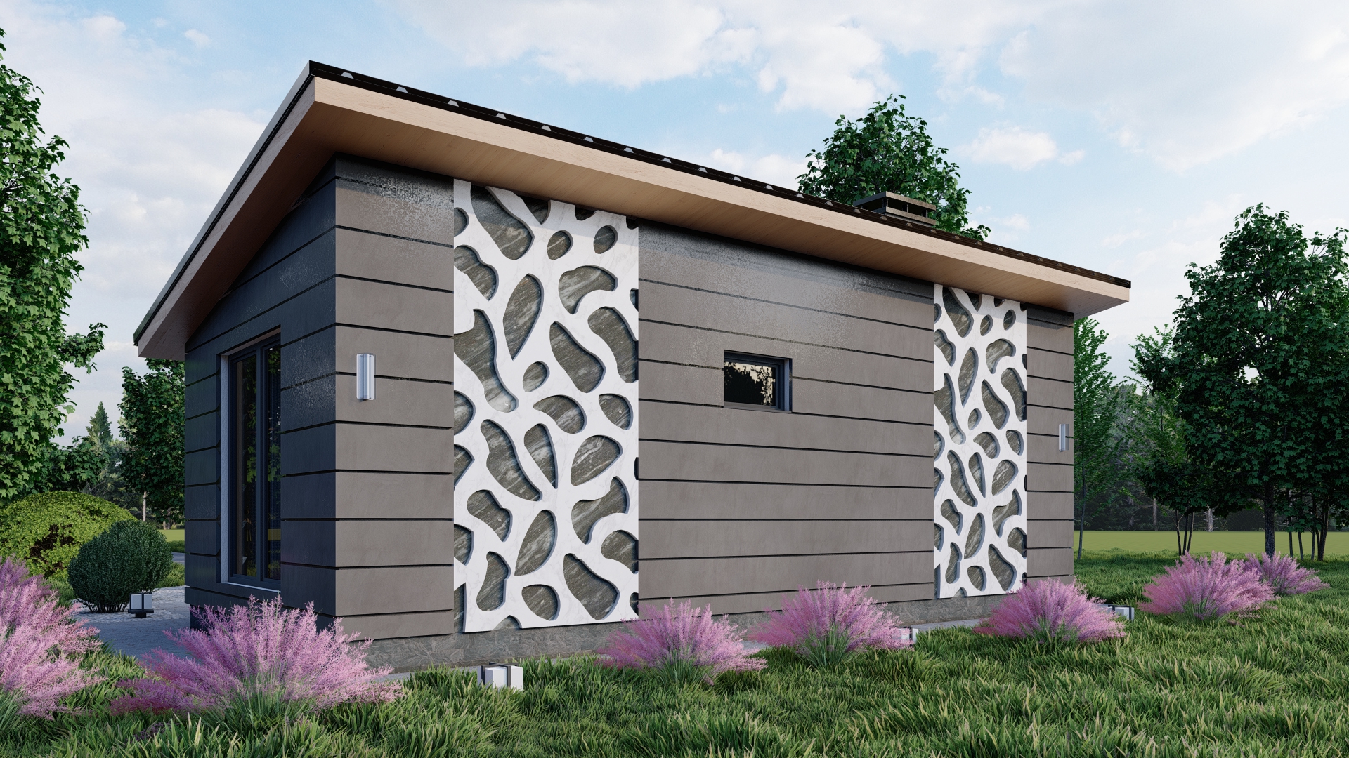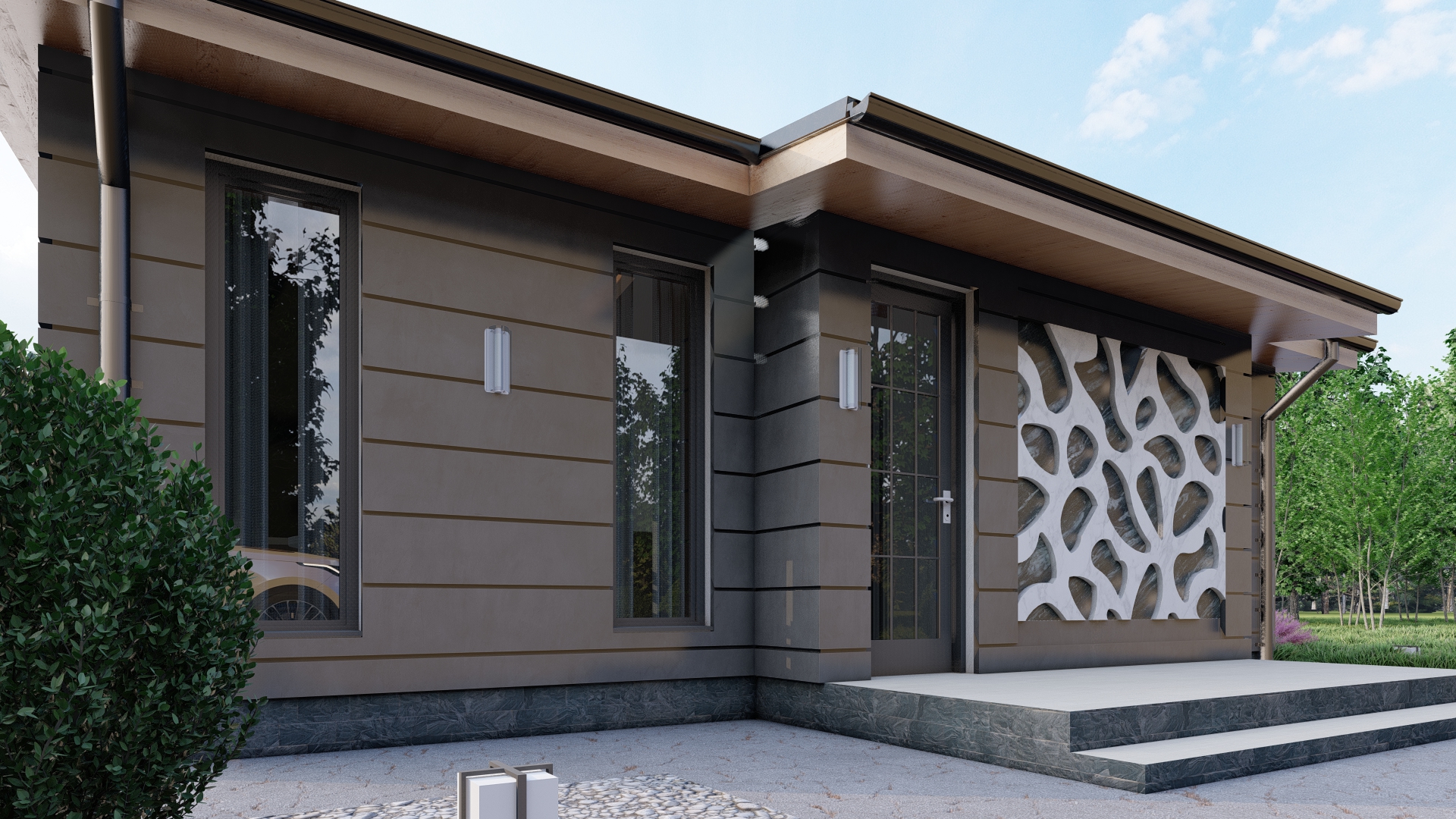 Цей сучасний одноповерховий будинок створений для тих, хто цінує затишок, природу та теплі вечори біля каміну. Облицювання з декоративного темного каменю та дерев’яні акценти надають йому преміального вигляду, а зручне планування забезпечує комфортне перебування навіть у холодну пору року. Велика тераса з каміном і зона барбекю дозволяють насолоджуватися кожною миттю на природі.