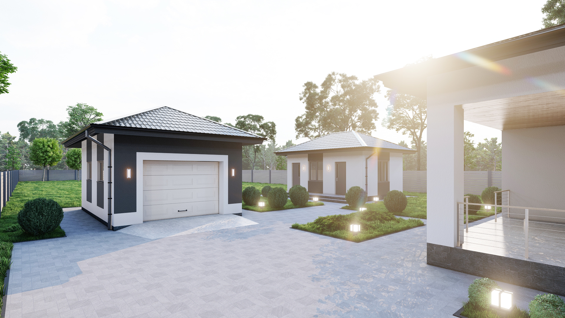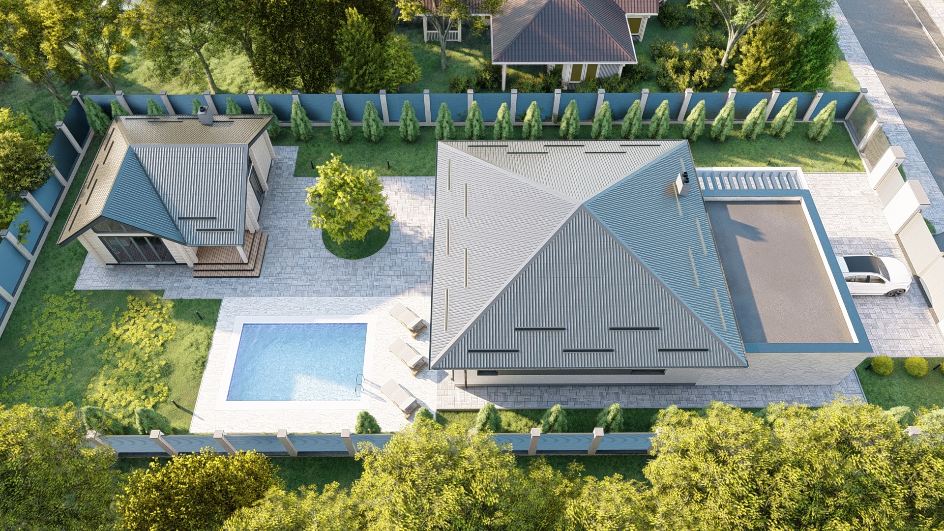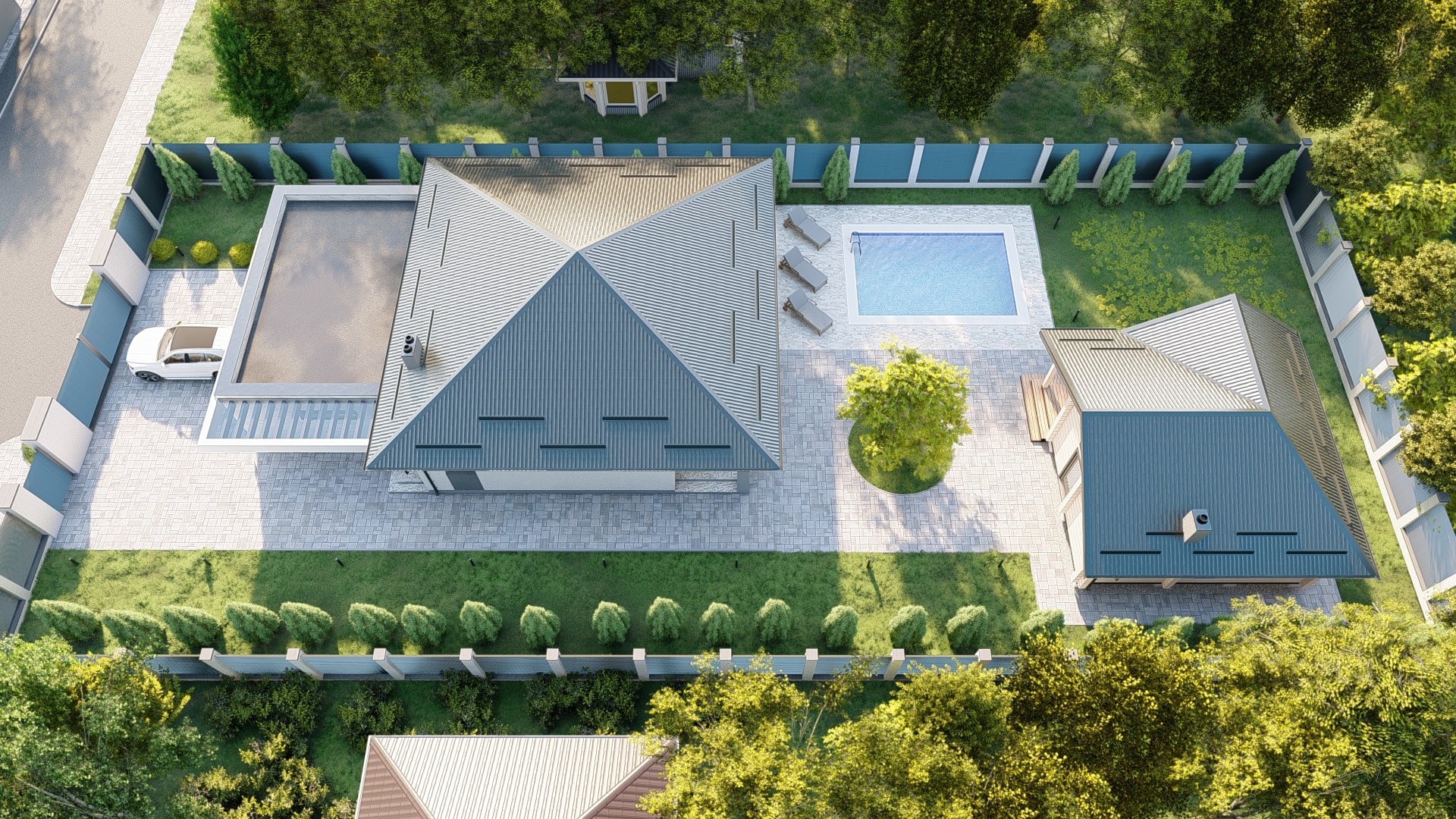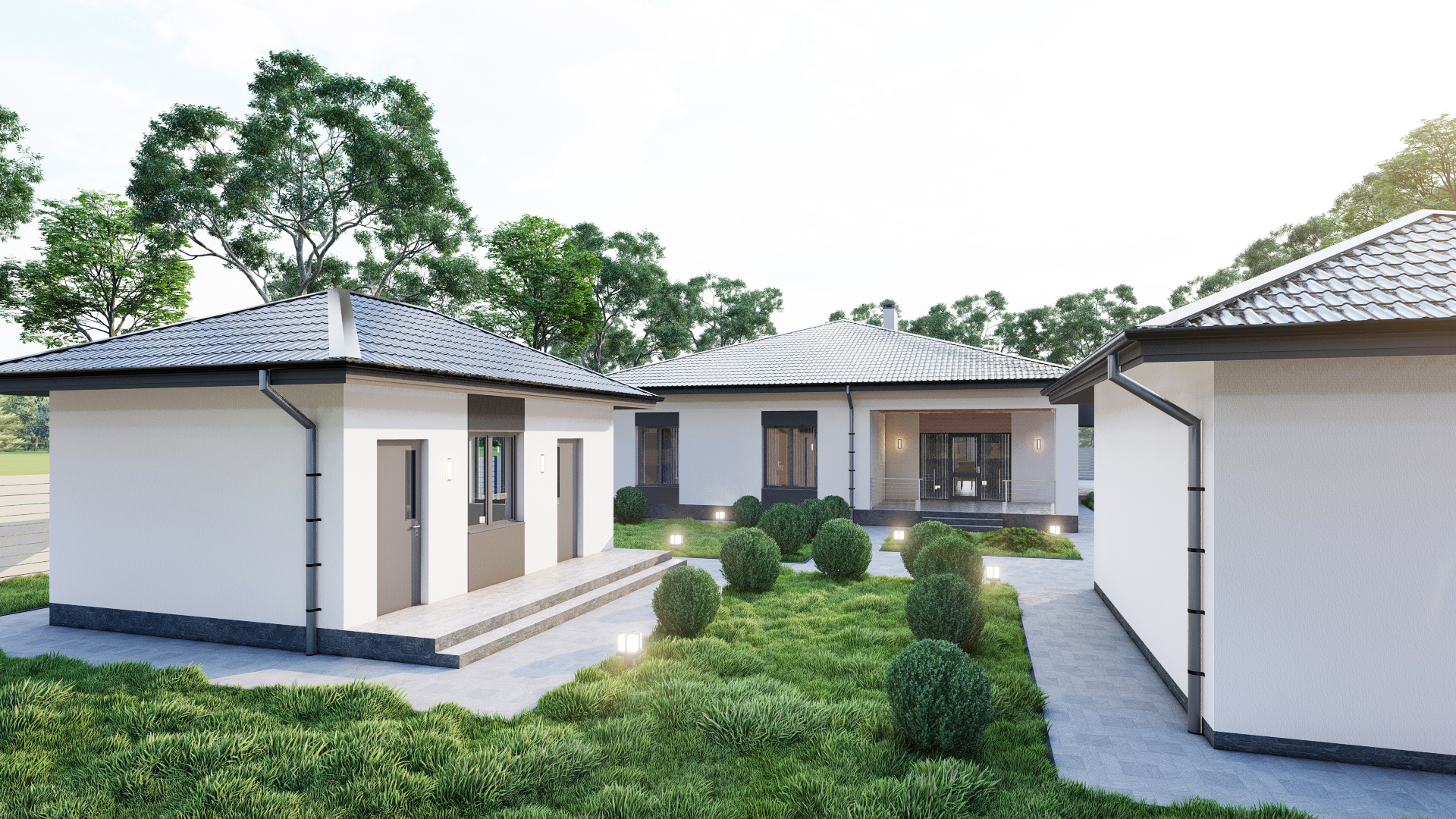 Цей проєкт є втіленням мрії про ідеальне заміське життя, де поєднано розкіш, комфорт та безмежні можливості для відпочинку. Резиденція складається з основного будинку та окремого гостьового комплексу з банею або зоною СПА, розташованих на просторій ділянці. Архітектура будинку виконана в сучасному стилі з елементами класики, де вальмова покрівля надає солідності, а велика площа скління наповнює приміщення світлом. Основний будинок включає простору вітальню, декілька спалень, кабінет та гараж на два автомобілі. Окрема будівля з басейном, лаунж-зоною та гостьовими кімнатами створює ідеальні умови для прийому гостей або релаксу всією родиною. Цей проєкт створений для тих, хто не шукає компромісів і прагне отримати максимум від власного дому.