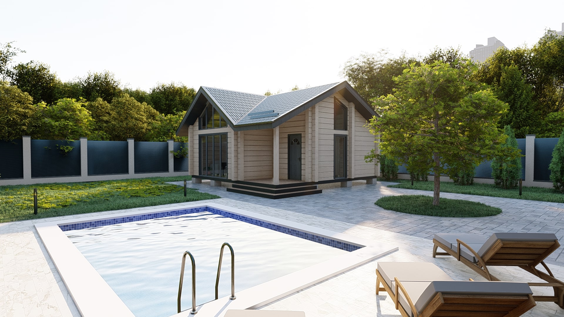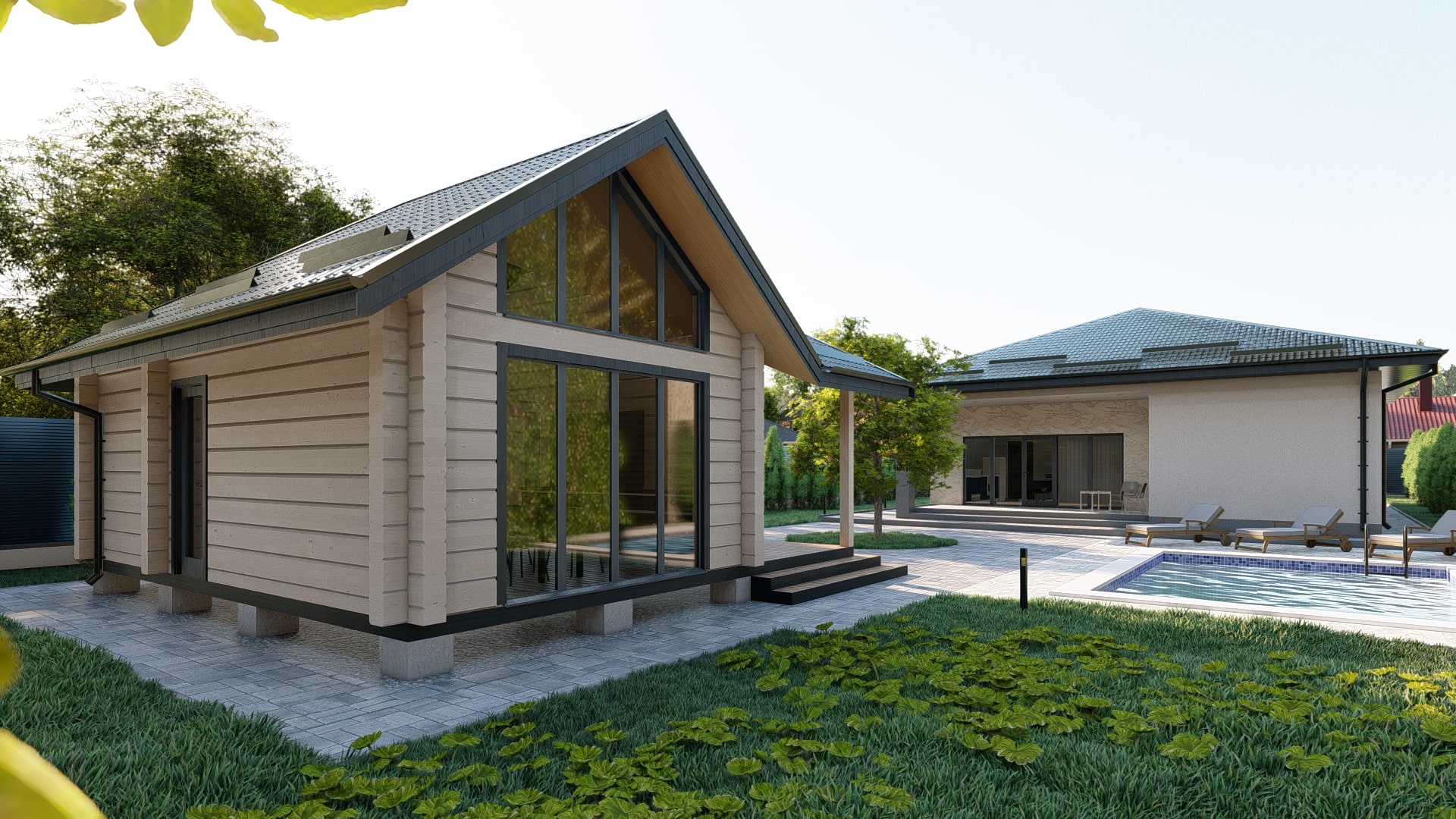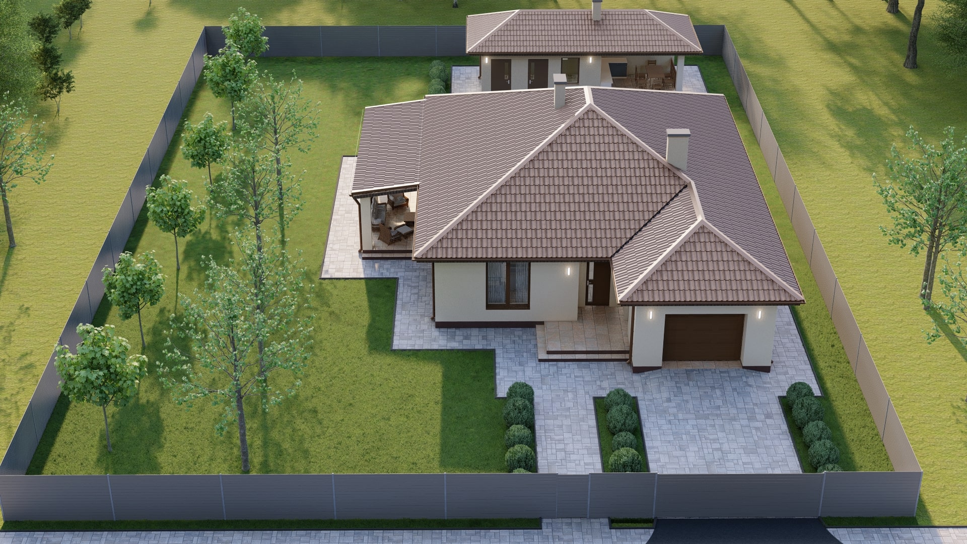 Цей проєкт є втіленням мрії про ідеальне заміське життя, де поєднано розкіш, комфорт та безмежні можливості для відпочинку. Резиденція складається з основного будинку та окремого гостьового комплексу з банею або зоною СПА, розташованих на просторій ділянці. Архітектура будинку виконана в сучасному стилі з елементами класики, де вальмова покрівля надає солідності, а велика площа скління наповнює приміщення світлом. Основний будинок включає простору вітальню, декілька спалень, кабінет та гараж на два автомобілі. Окрема будівля з басейном, лаунж-зоною та гостьовими кімнатами створює ідеальні умови для прийому гостей або релаксу всією родиною. Цей проєкт створений для тих, хто не шукає компромісів і прагне отримати максимум від власного дому.