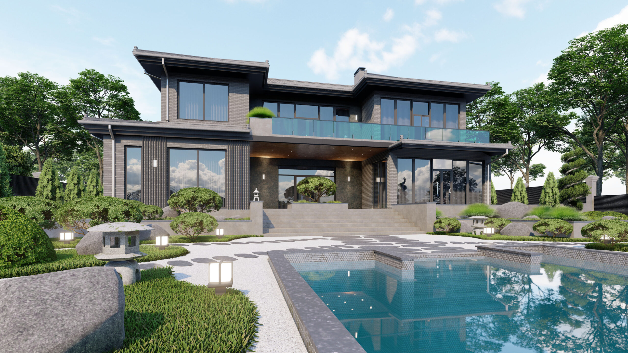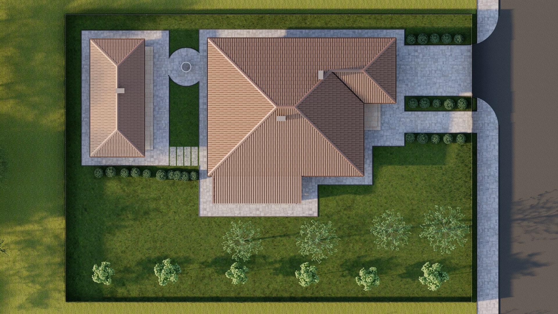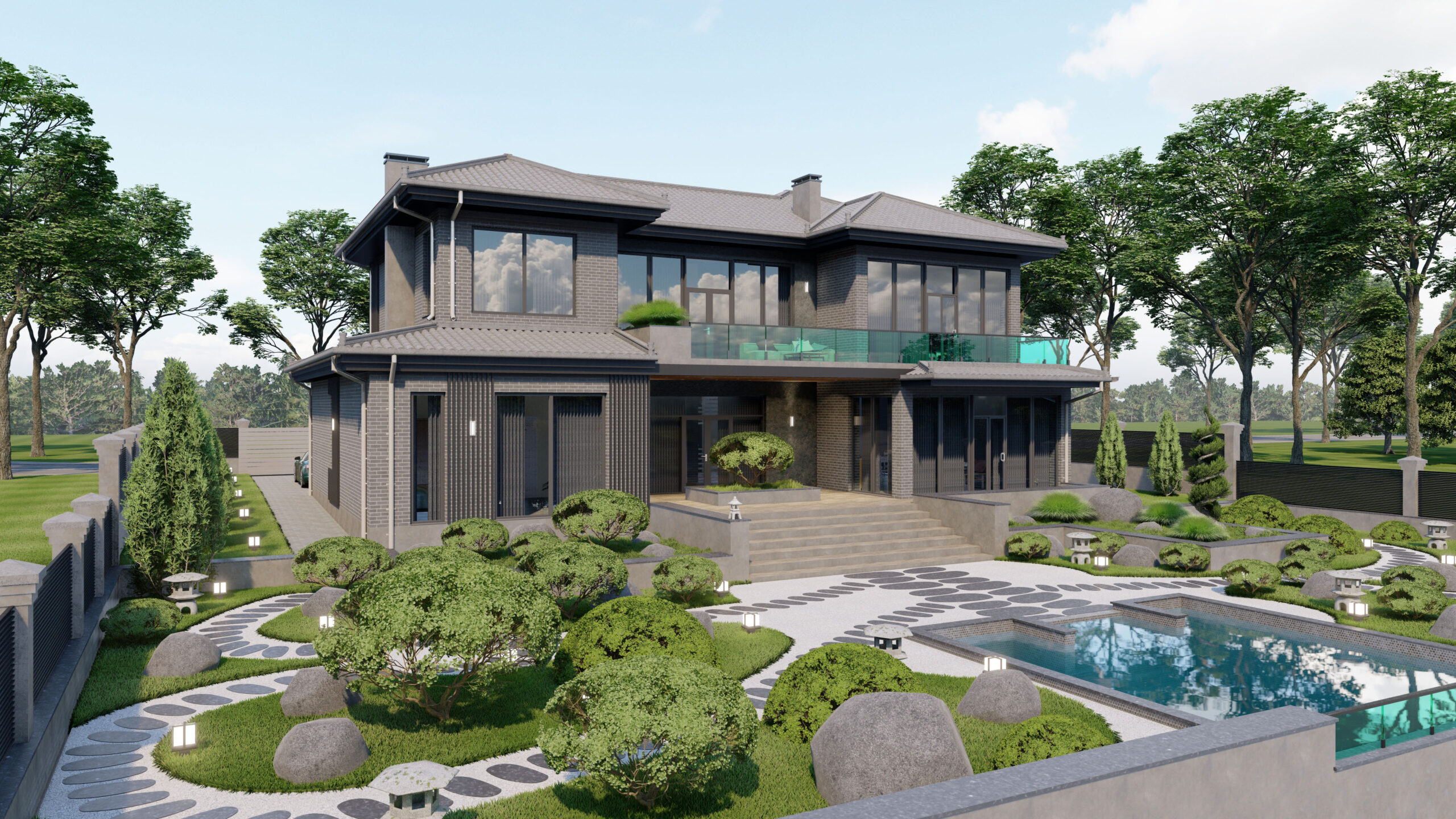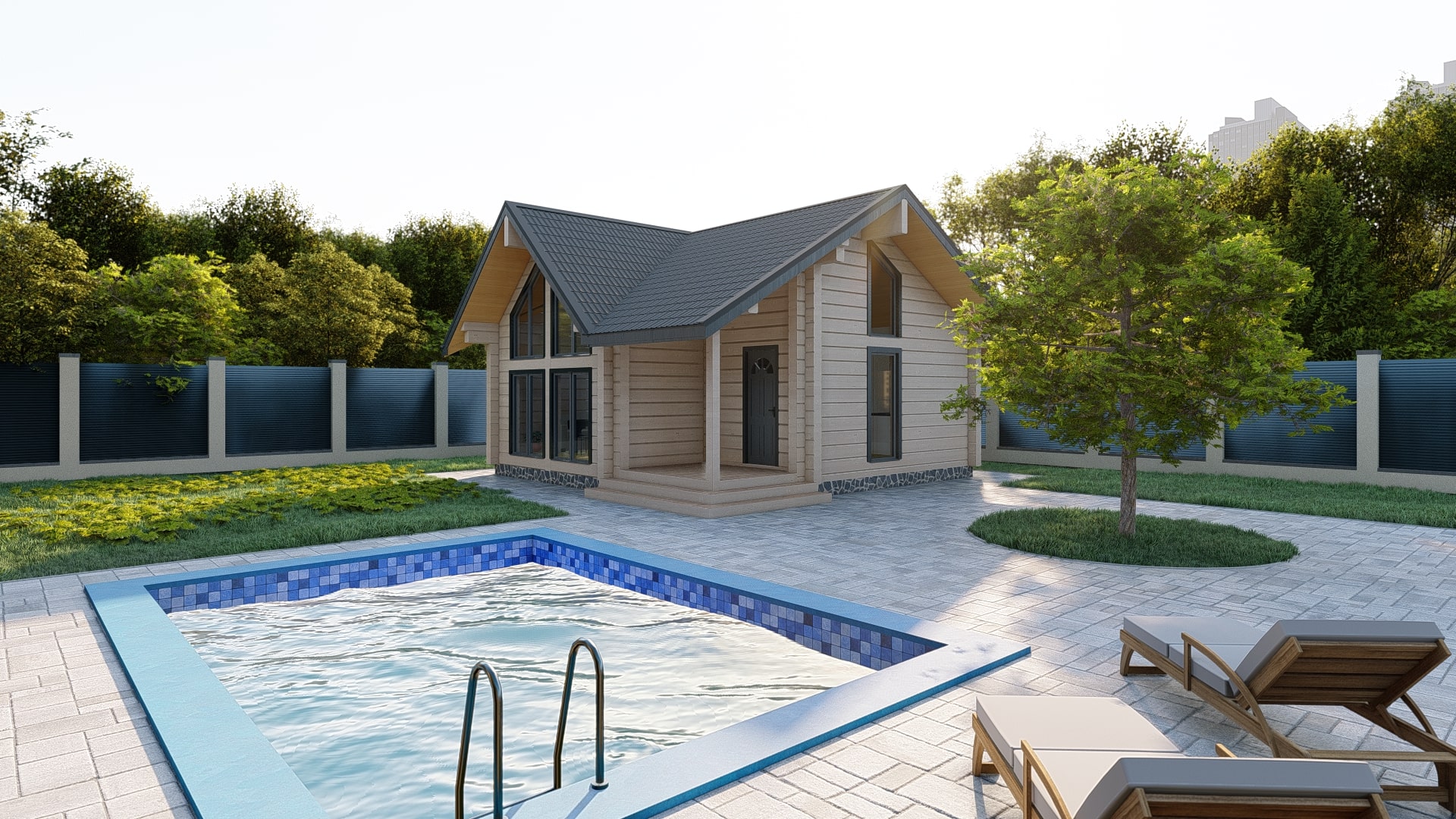 Цей проєкт є втіленням мрії про ідеальне заміське життя, де поєднано розкіш, комфорт та безмежні можливості для відпочинку. Резиденція складається з основного будинку та окремого гостьового комплексу з банею або зоною СПА, розташованих на просторій ділянці. Архітектура будинку виконана в сучасному стилі з елементами класики, де вальмова покрівля надає солідності, а велика площа скління наповнює приміщення світлом. Основний будинок включає простору вітальню, декілька спалень, кабінет та гараж на два автомобілі. Окрема будівля з басейном, лаунж-зоною та гостьовими кімнатами створює ідеальні умови для прийому гостей або релаксу всією родиною. Цей проєкт створений для тих, хто не шукає компромісів і прагне отримати максимум від власного дому.