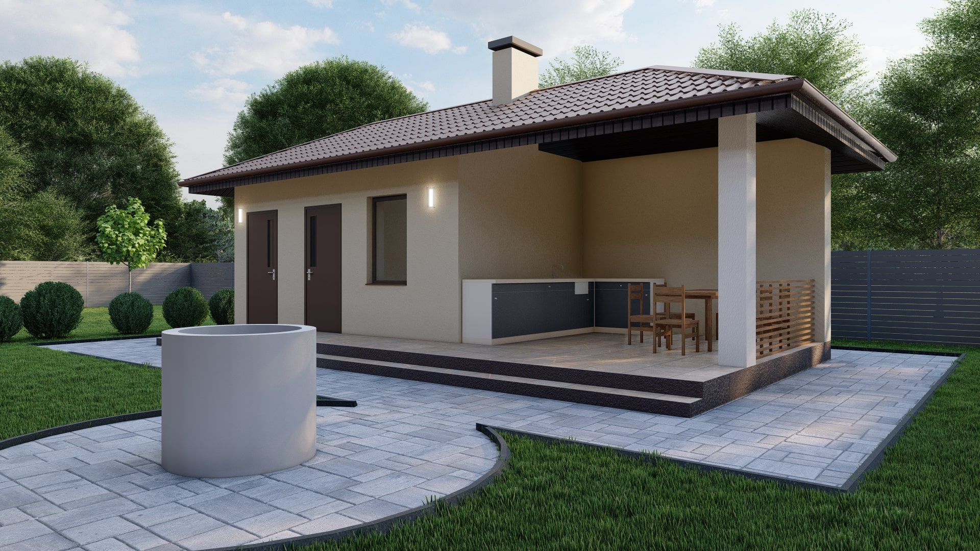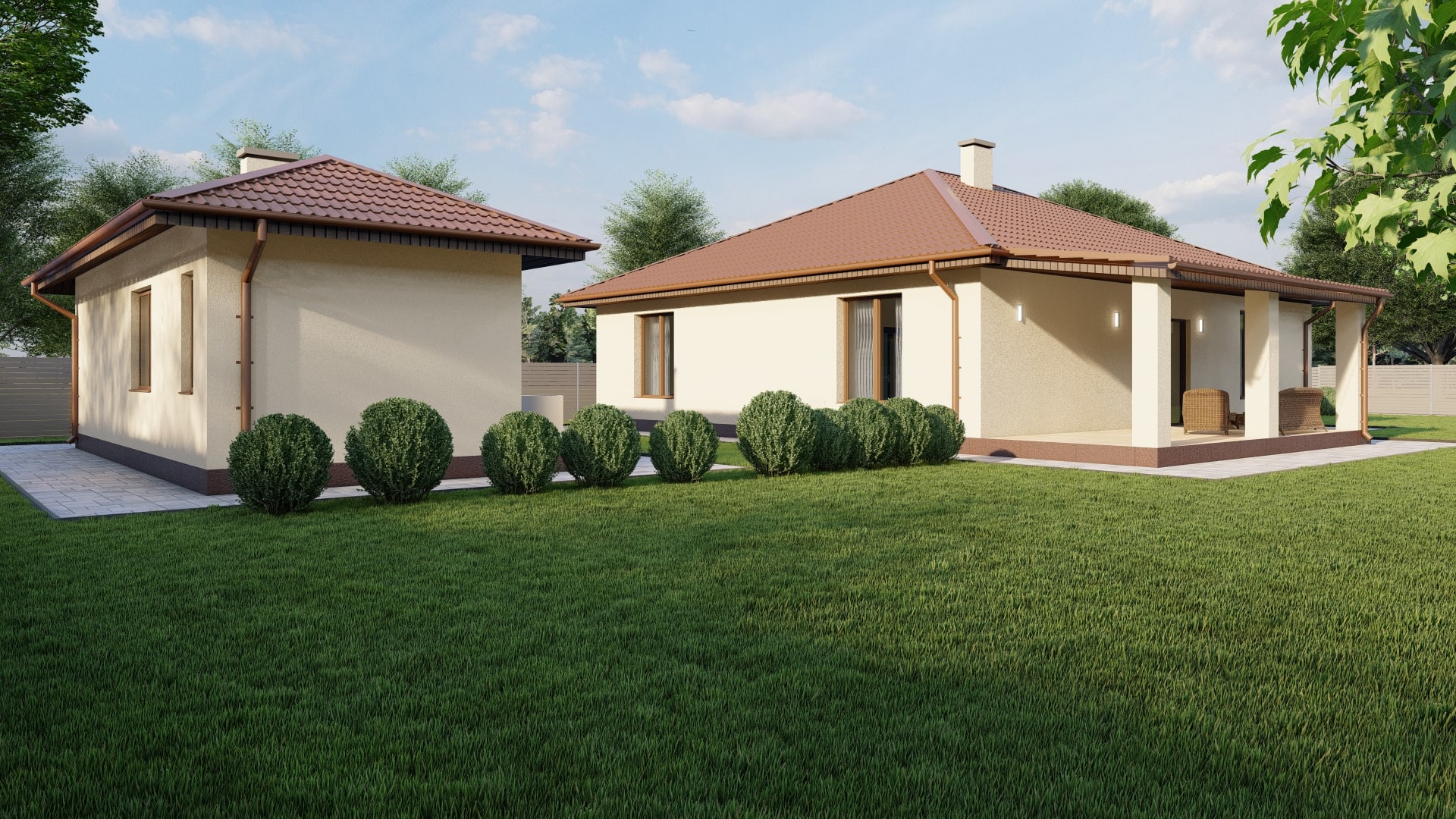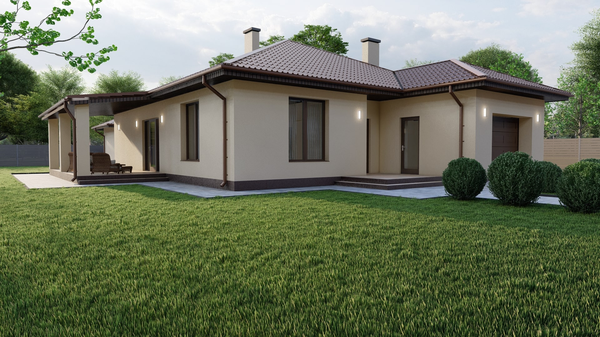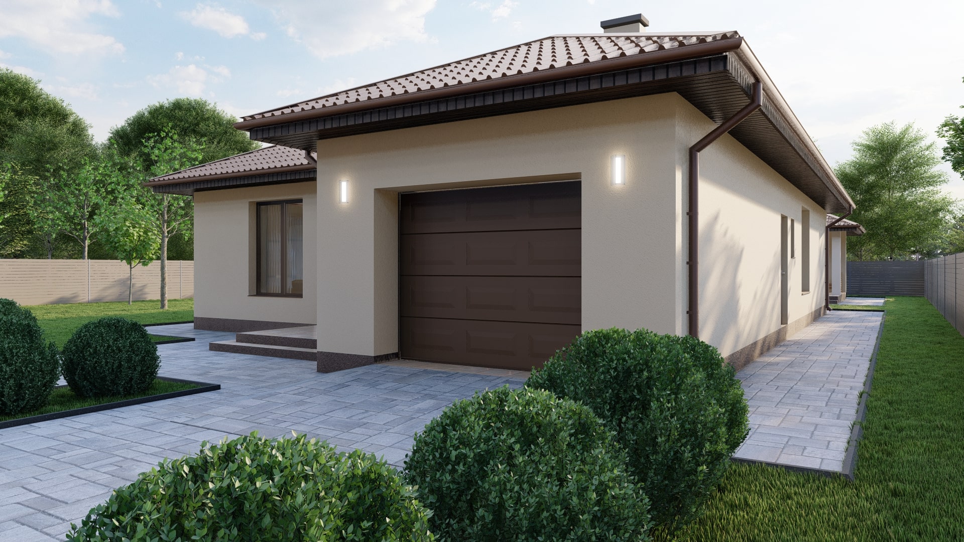 Проєкт "Затишок" — це ідеальний вибір для тих, хто мріє про гармонійне життя в класичному одноповерховому будинку. Архітектура, виконана в теплих бежевих та коричневих тонах, створює відчуття домашнього тепла, а складна вальмова покрівля додає будівлі солідності та елегантності. Ключовою перевагою проєкту є простора крита тераса, яка стане улюбленим місцем для сімейних вечорів або ранкової кави. Будинок має продумане планування, що включає в себе зручну кухню-вітальню, кілька спалень та інтегрований гараж. Цей проект створений для комфортного життя без компромісів, поєднуючи перевірені часом рішення з сучасними стандартами якості.